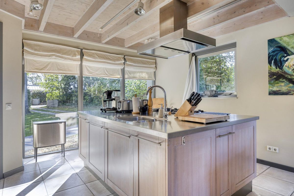 Via de entree komt u direct in de lichte woonkeuken met grote raampartijen en openslaande deuren naar de tuin. De keuken is voorzien van een ruim kook- en spoeleiland met vaatwasser, gaskookplaat, afzuigkap en praktische inbouwkasten. Hierin bevindt zich tevens de cv-opstelling.