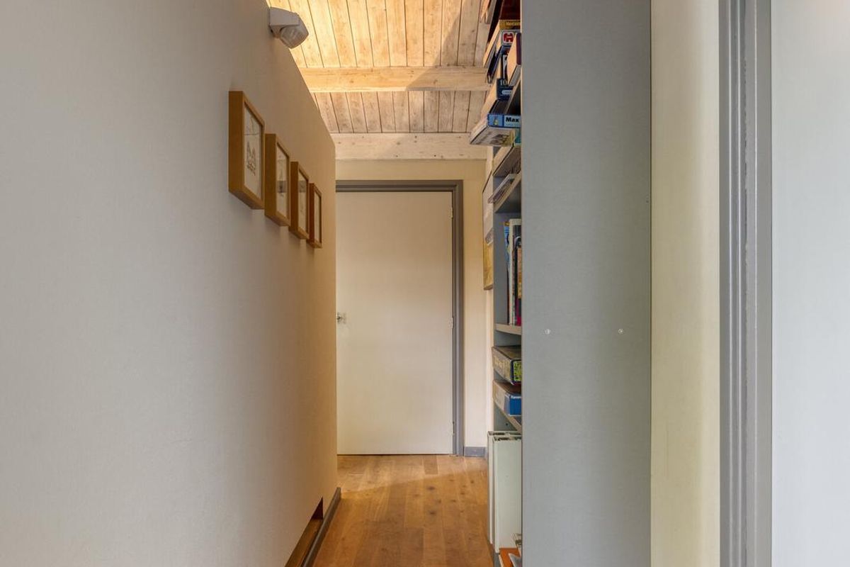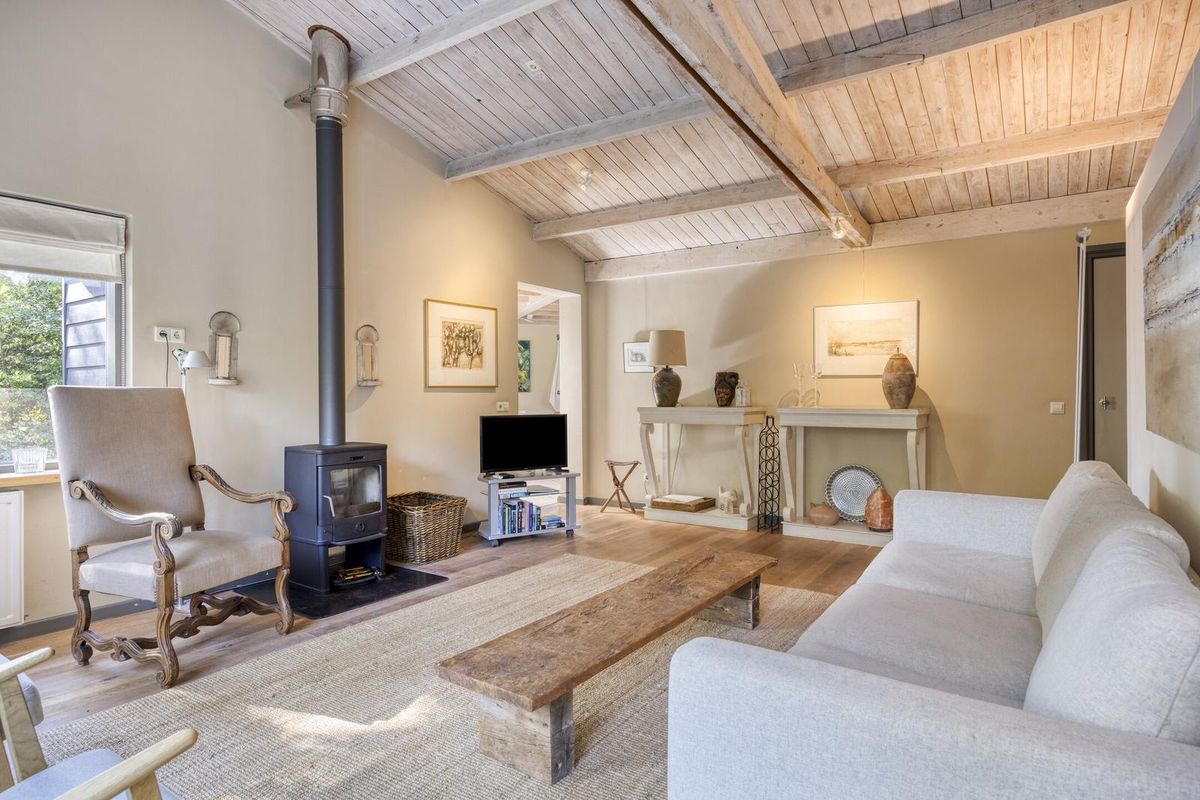 Aansluitend bevindt zich de sfeervolle woonkamer met een schuin dak, authentieke balkenplafonds en een gezellige houtkachel, ideaal voor de knusse avonden. Vanuit hier heeft u vanachter de scheidingswand toegang tot drie slaapkamers (waarvan één met wastafel).