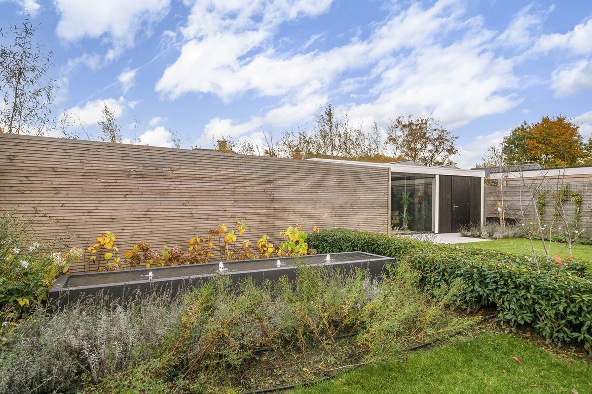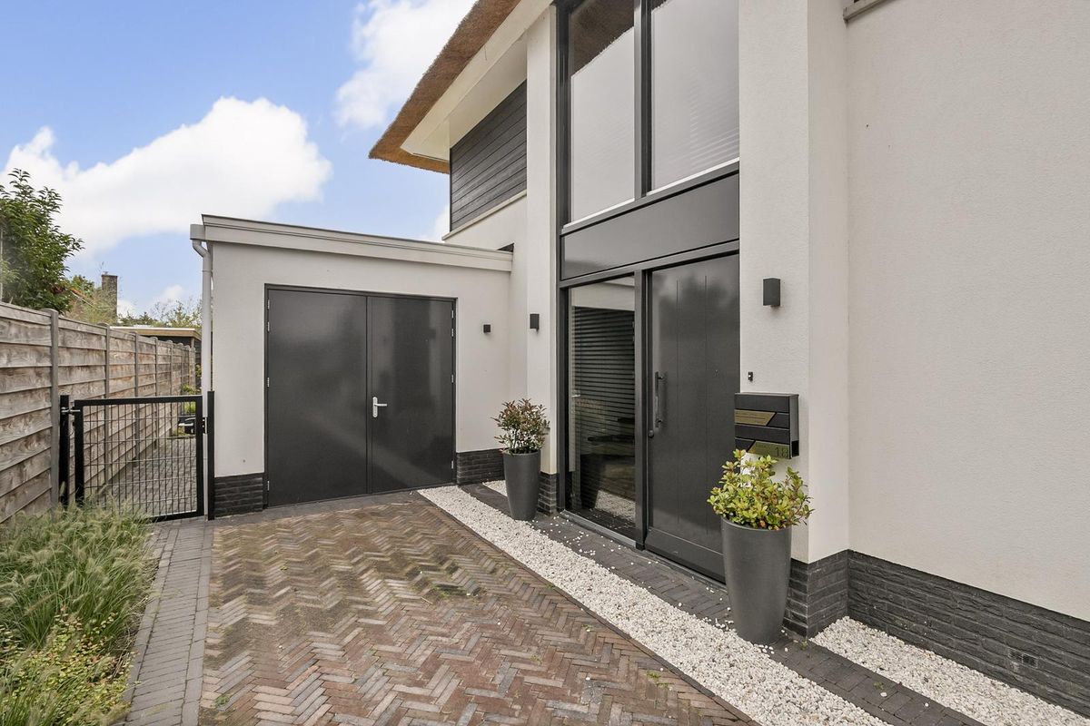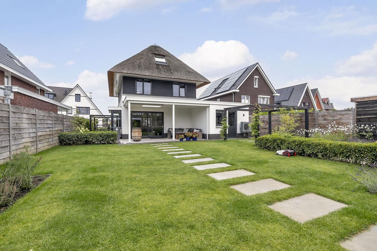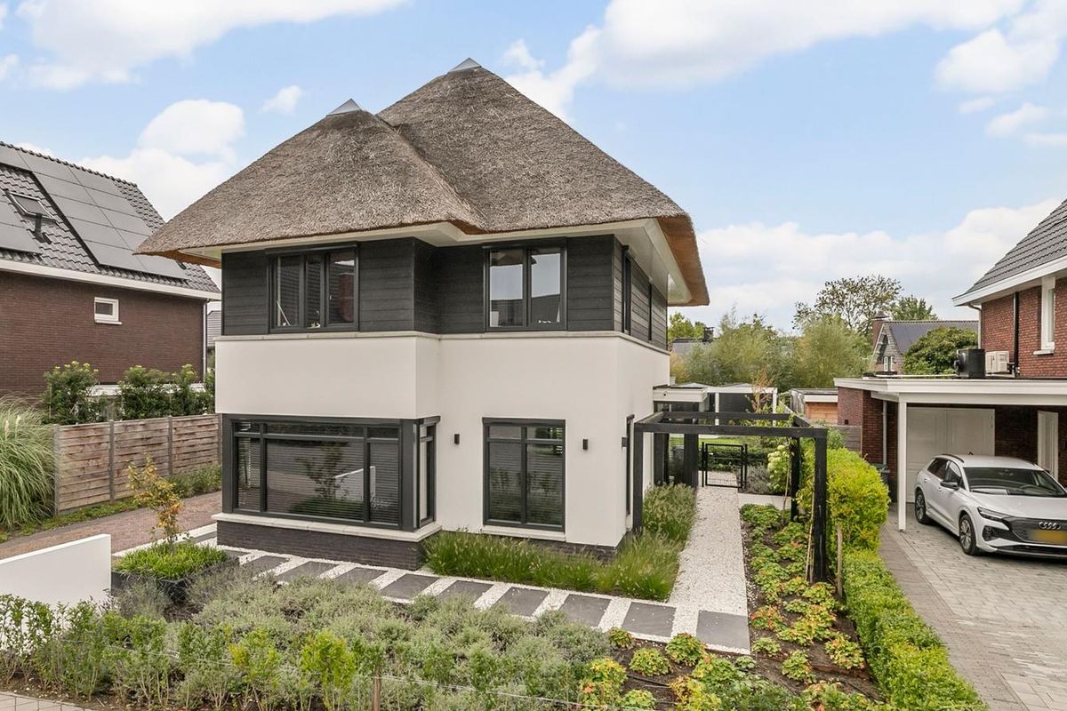 Begane grond: al bij aankomst maakt de villa indruk. De rieten kap in combinatie met het genuanceerde metselwerk, de witte gevels en zwarte houten elementen straalt een tijdloze klasse uit. De oprit, fraai aangelegd met grind en tegelwerk, biedt ruimte aan meerdere voertuigen en beschikt over een elektrische laadpaal. Rondom de woning zorgen sierlijke tuinverlichting en een geautomatiseerd beregeningssysteem (Rain Bird) voor een perfect onderhouden buitenruimte met allure.