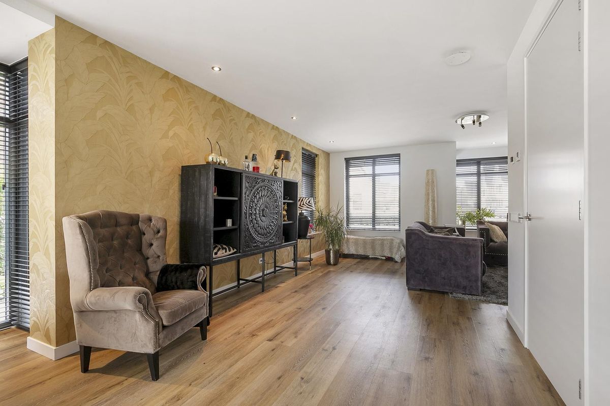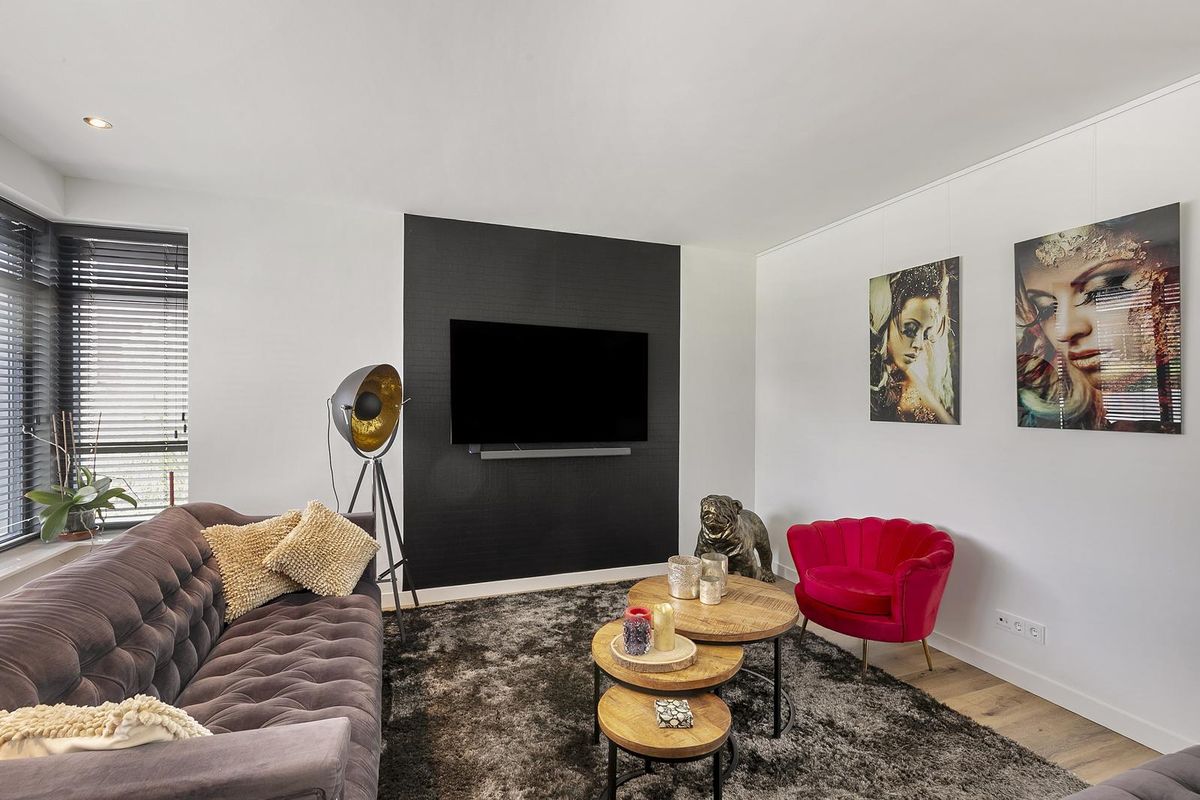De woonkamer aan de voorzijde is een stijlvolle leefruimte met grote raampartijen die het daglicht uitnodigen. De tv-wand, bekleed met warm behang, vormt een sfeervol middelpunt. Langs het plafond zorgen inbouwspots voor een zachte, indirecte verlichting, perfect afgestemd op elk moment van de dag. Via een doorloop is de woning verbonden met het hart: de imposante leefkeuken.