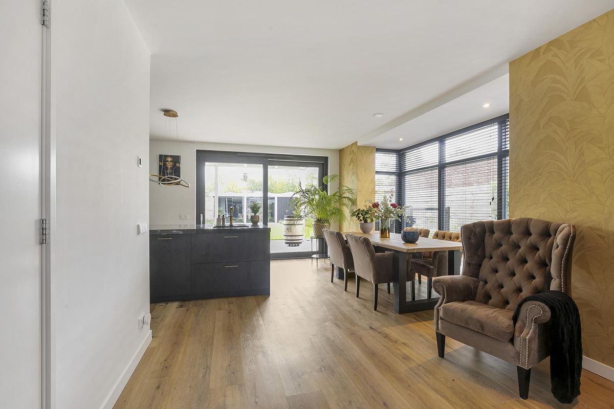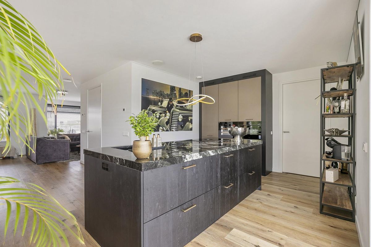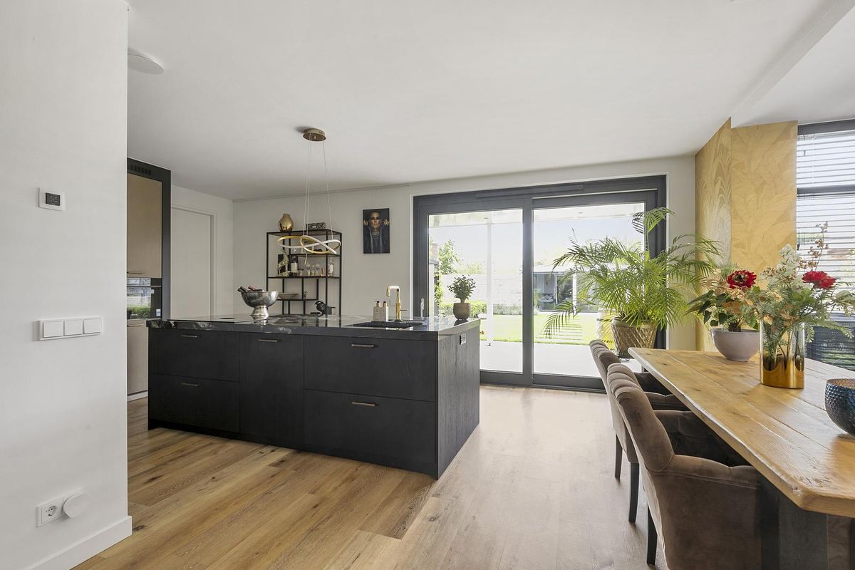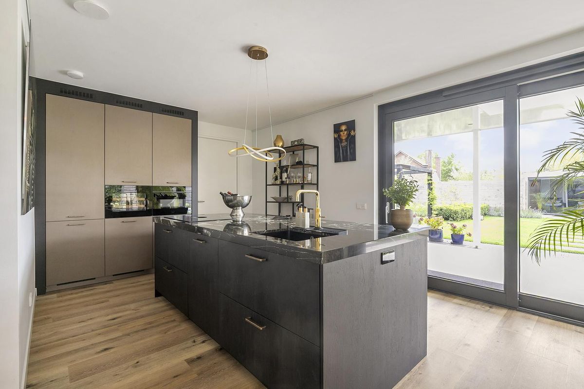 Aan de achterzijde van de villa bevindt zich deze royale woonkeuken met eetgedeelte. Het kook- en spoeleiland is uitgevoerd met zwart gemêleerd werkblad en centraal geplaatst. De keuken is voorzien van een hoogwaardige Siemens-inbouwlijn met combi-oven/magnetron, vaatwasser en koelkast, allemaal harmonieus verwerkt in een greeploze kastenwand met gouden accenten. De Bora-inductieplaat met geïntegreerde afzuiging, de Quooker en een wijnkoeler van Liebherr maakt het geheel compleet. Een schuifpui opent naar de overkapping in de achtertuin – een naadloze overgang tussen binnen en buiten. Tot slot biedt de woning nog een praktische bijkeuken, bereikbaar vanuit de keuken, met vaste kastenwand, opstelplaats voor wasapparatuur en warmtepomp, een extra koelkast/vriezer en directe toegang tot de tuin en oprit.