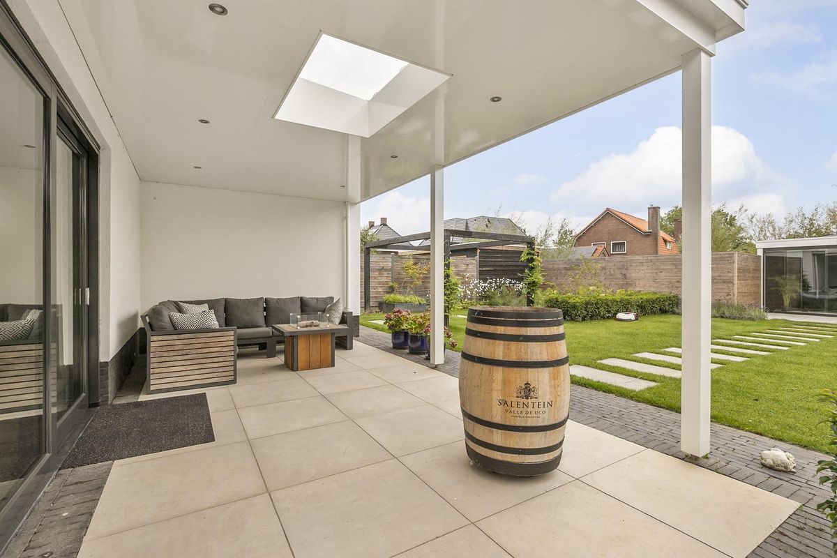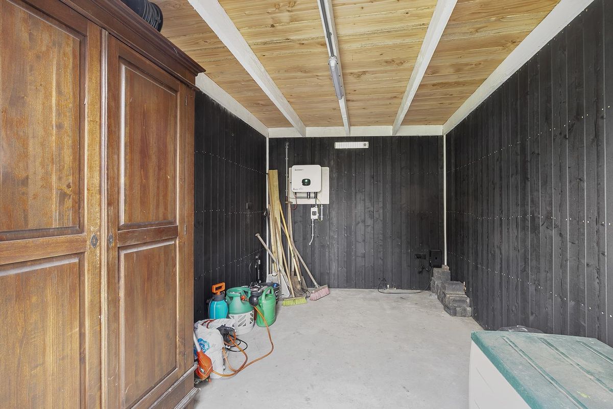 Tuin: de achtertuin is smaakvol aangelegd met een combinatie van gras, bloemperken, fraaie waterpartij en een stijlvolle pergola. Onder de houten overkapping en in een elegante ruimte met glazen schuifpui met inbouwverlichting en elektra kun je heerlijk vertoefen. Aangrenzend aan het tuinhuis is een berging gesitueerd waar zich ook de omvormer van de tien zonnepanelen bevind.