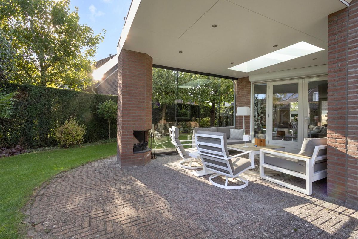 De tuin is prettig ruim en op het zuidoosten gelegen. Direct aan de woning is een sfeervolle overkapping geplaatst (2023) met geïntegreerde openhaard — een fijne plek om langer buiten te zitten.