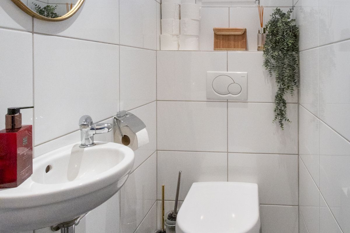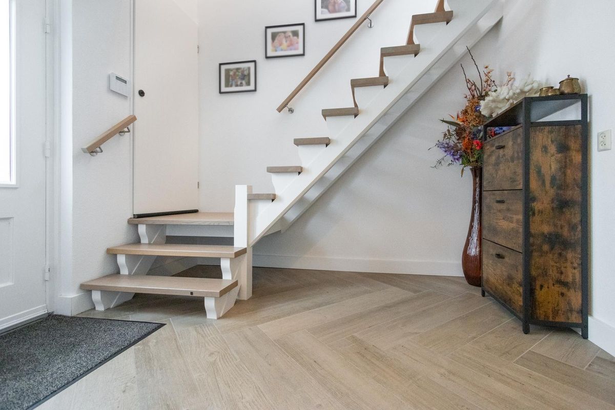 Je bereikt de entree via de oprit aan de zijgevel. In de ontvangsthal vind je het toilet, de vernieuwde meterkast (2023) en de nieuwe eikenhouten trap naar de verdieping.