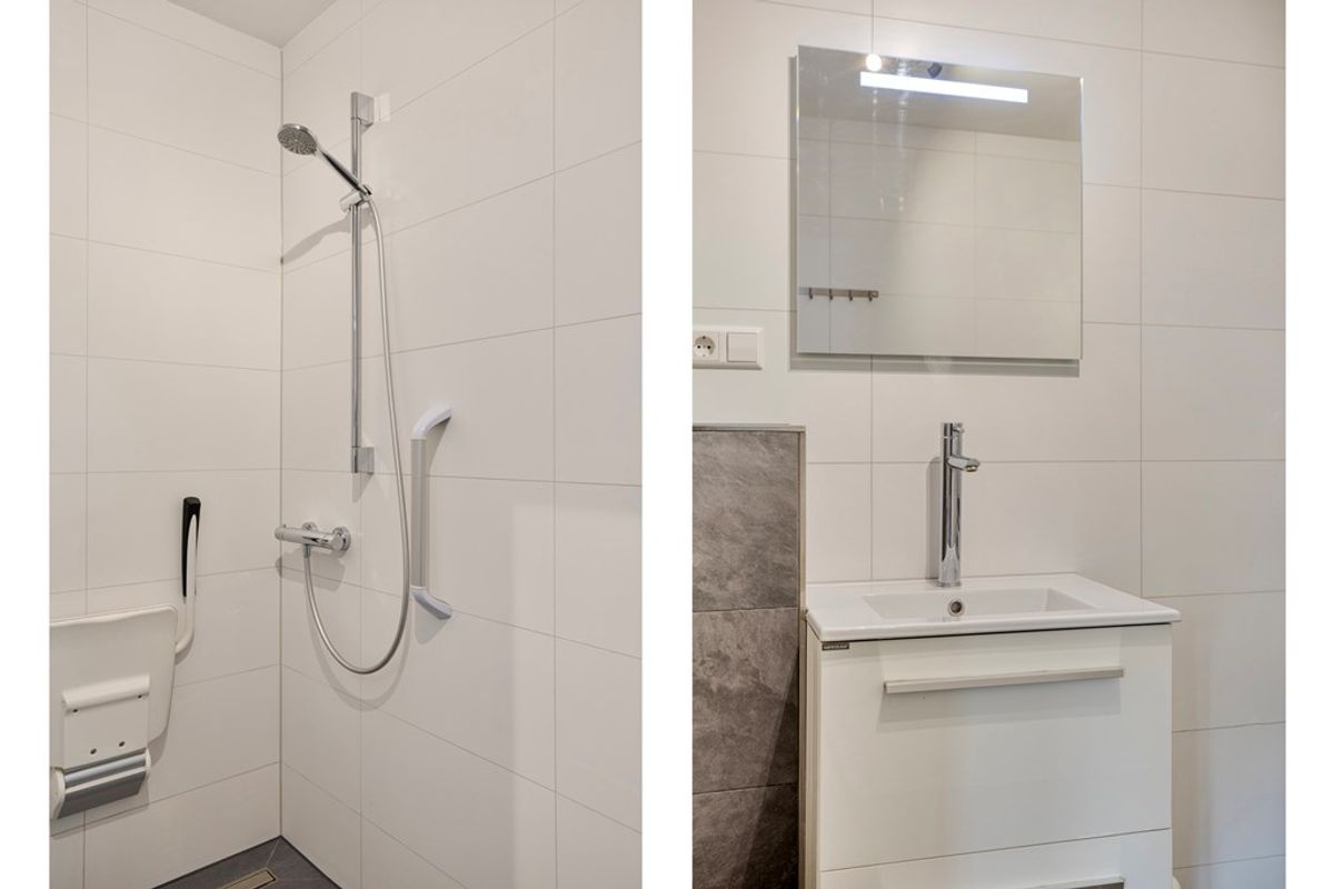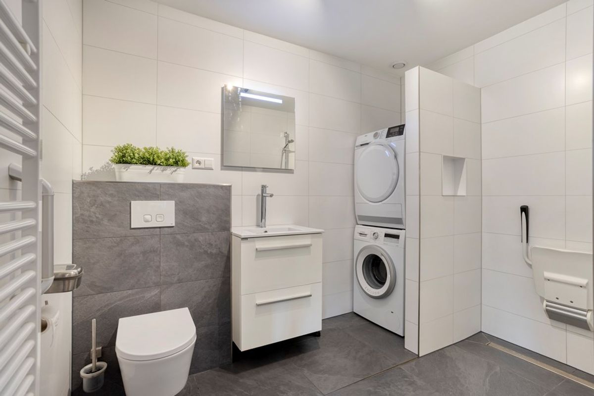 De badkamer op de begane grond is van alle gemakken voorzien: een ruime inloopdouche, een hangend toilet, wastafelmeubel met dubbele lades én ruimte voor zowel je wasmachine als je droger. Ook aan de details is gedacht – denk aan een designradiator en mechanische ventilatie. Die dagelijkse klusjes draaien zo op rolletjes! Je hoeft geen trap op met je wasgoed, hoe fijn is dat?