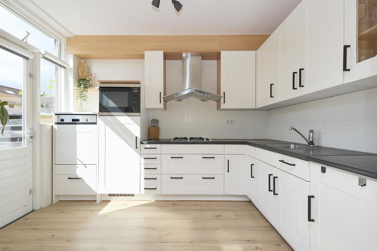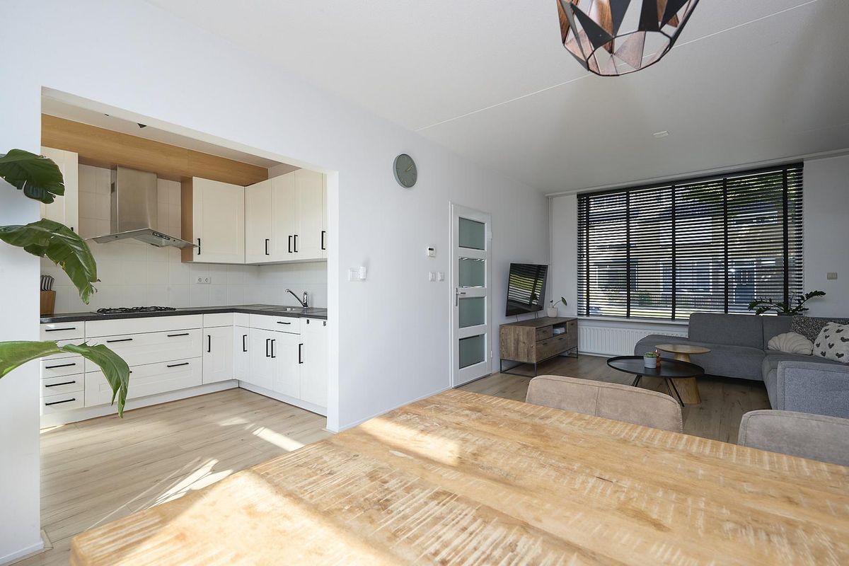 Via de hal met toilet, meterkast en open trap komt u binnen in de royale woonkamer. Grote raampartijen en openslaande tuindeuren zorgen hier voor veel licht en een prettige sfeer. De nette laminaatvloer geeft de ruimte een warme uitstraling. De open keuken is uitgerust met een moderne inbouwkeuken voorzien van gaskookplaat, afzuigkap, combi-magnetron, koelkast en vaatwasser. Vanuit hier stapt u zo de zonnige en onderhoudsvriendelijke achtertuin in met gezellige houten terrasoverkapping, een stenen berging en een achterom naar het garagepleintje.