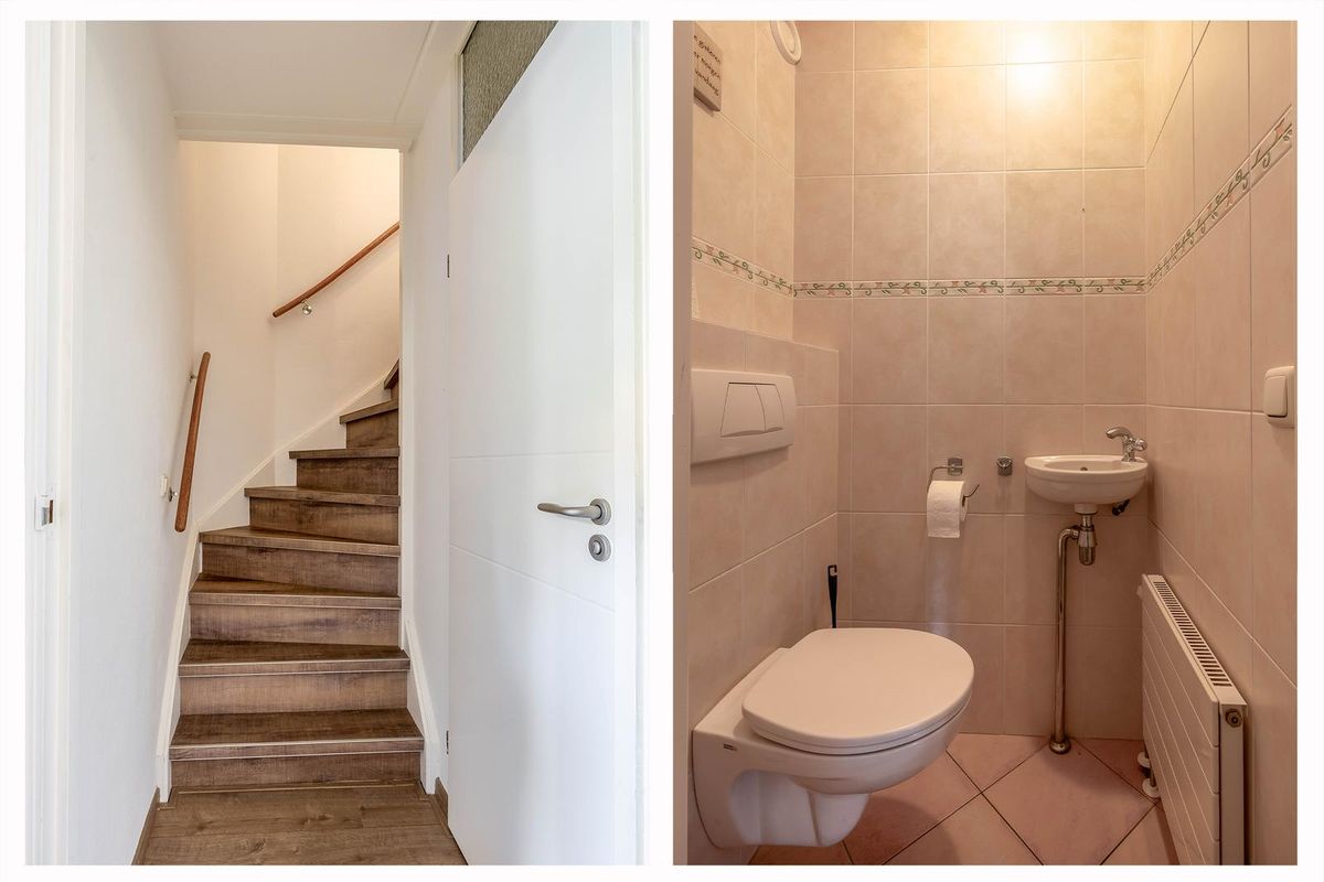 Verder is in de woonkamer nog een portaal met trapopgang en toiletruimte welke geheel betegeld is en v.v. wandcloset, fontein en verwarming.