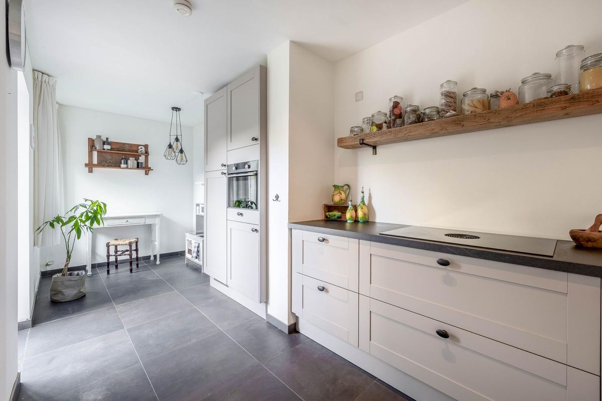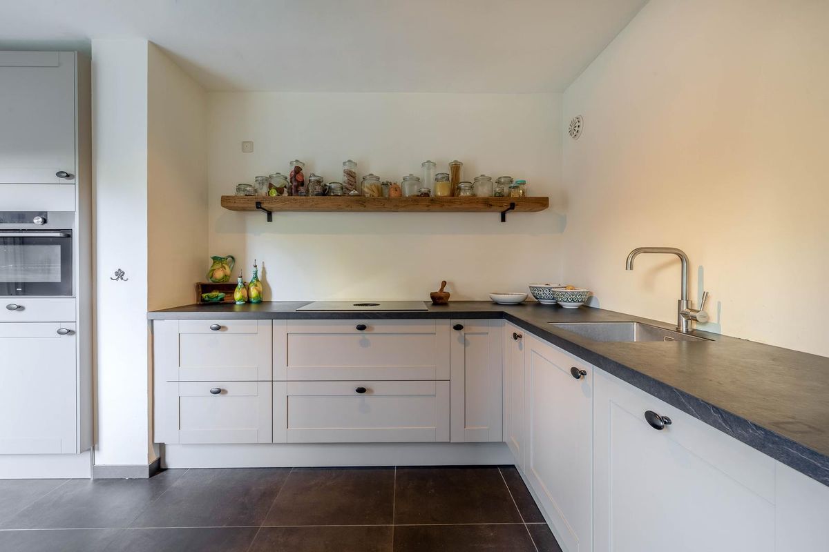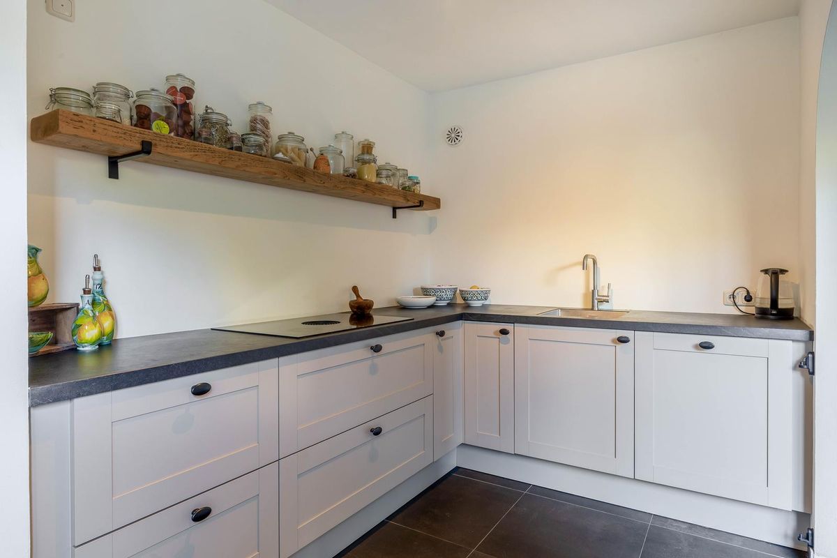 Woonkamer (ca. 41m²) in Z-vorm met laminaatvloer, tuindeuren en airco. Middels een open trap is hier ook de fraaie vide bereikbaar. De vide (ca. 6m²) is voorzien van een laminaatvloer en bergkasten onder het schuine dak. Onder de vide bevindt zich de inpandige berging van ca. 13,5m² met loopdeur naar de oprit. Aansluitend ligt de uitgebouwde keukenruimte van ca. 13,5m² met tegelvloer en deur naar de tuin. De keuken is geheel vernieuwd in 2020. Deze staat in een hoek opgesteld en is ingericht met een koelkast, vaatwasser, oven, magnetron, inductiekookplaat met afzuiging en een kastenwand met voldoende opbergmogelijkheden.