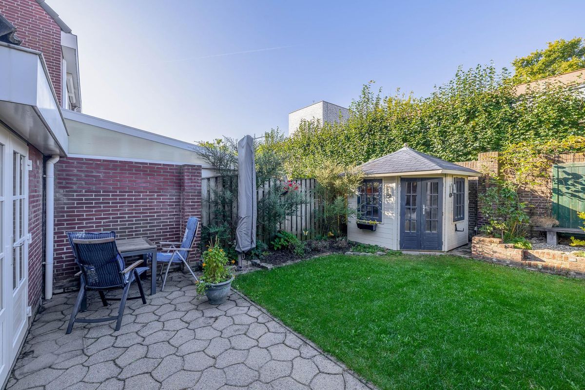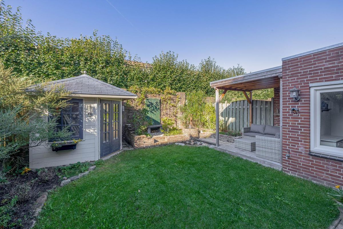 Leuk aangelegde achtertuin op het zuidwesten met terras en gras. De tuin is geheel omheind, biedt privacy en er staat een houten tuinhuisje. Tevens is er een houten overkapping aanwezig.