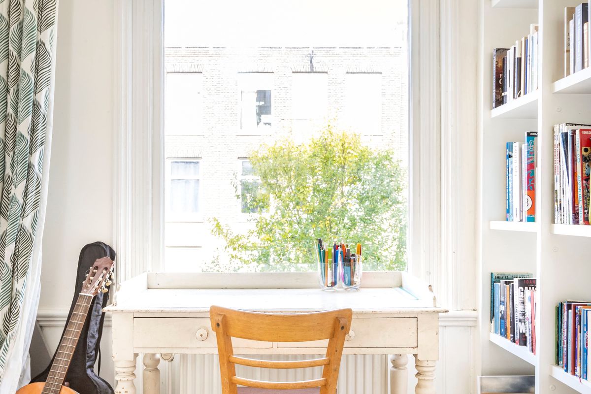Aan de voorzijde bevindt zich de sfeervolle woonkamer met openslaande deuren naar een Frans balkon en een werkende houtkachel. Tevens is hier een ruime werkkamer met veel daglicht en een handgemaakte kastenwand van vloer tot plafond.