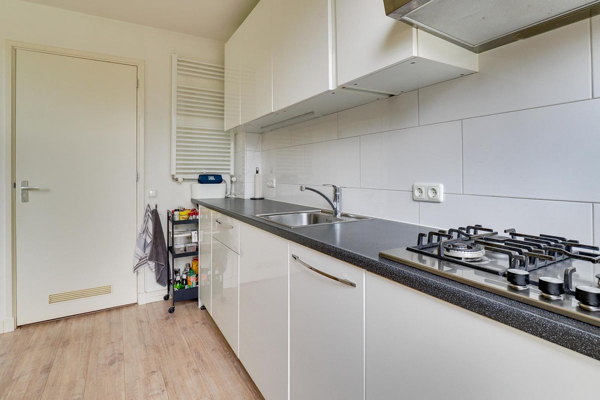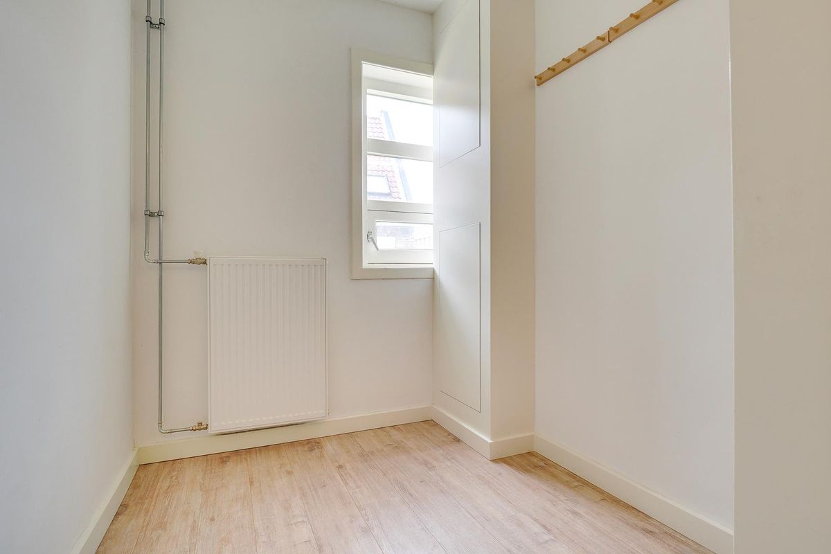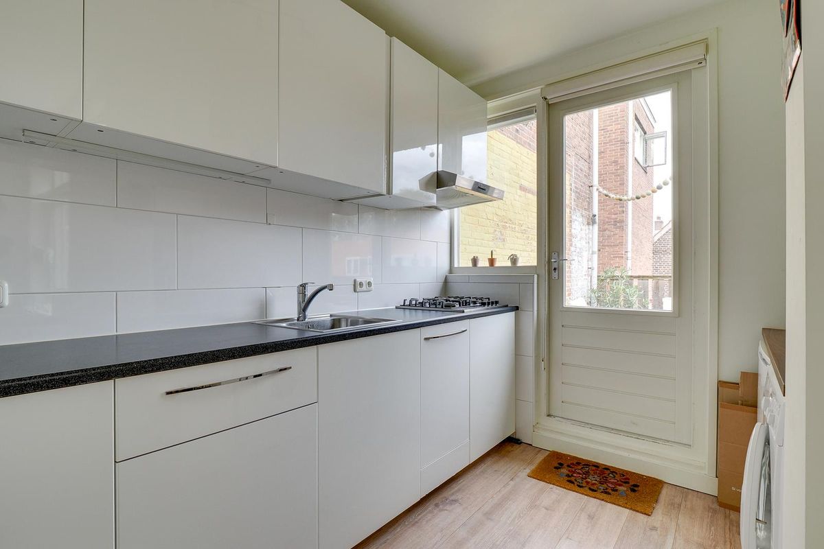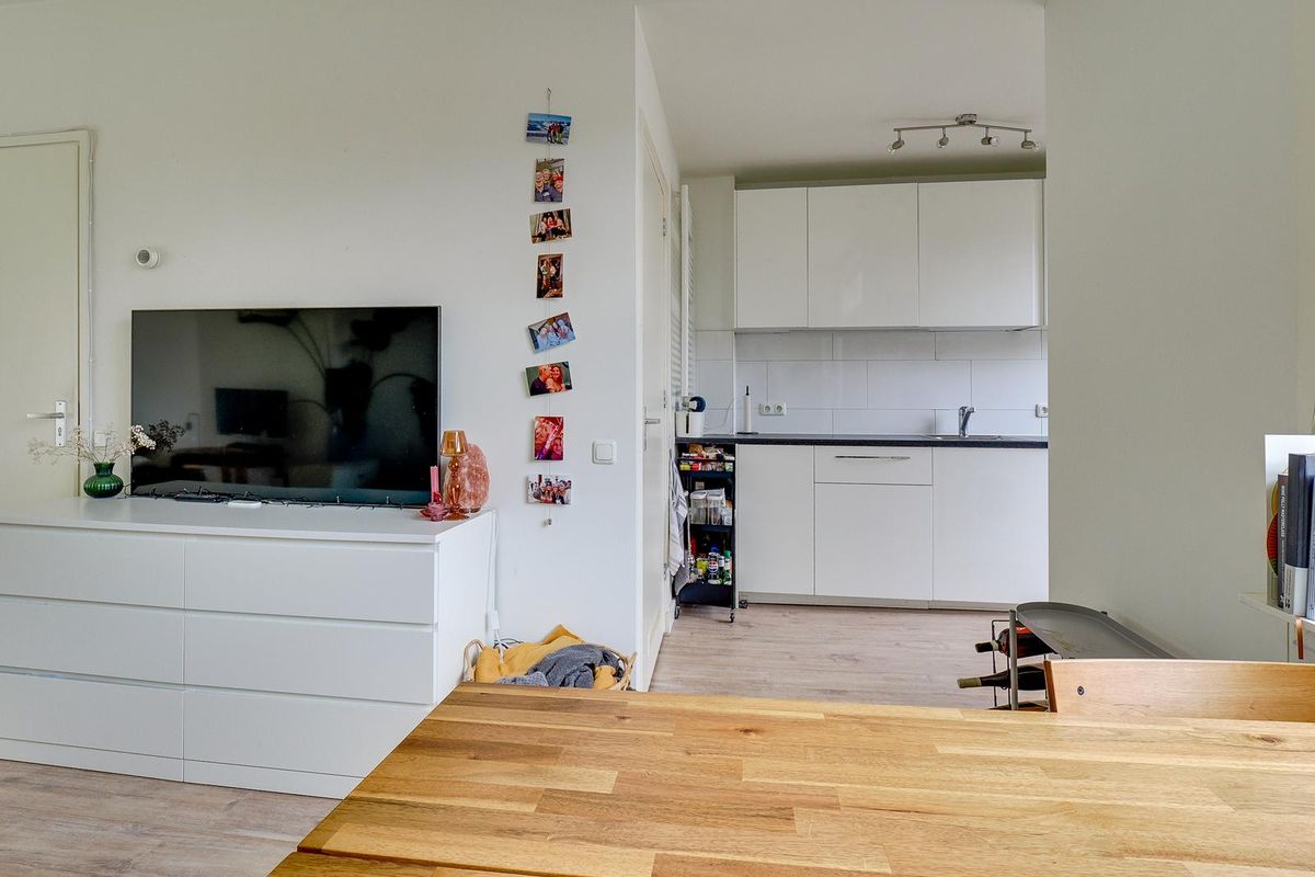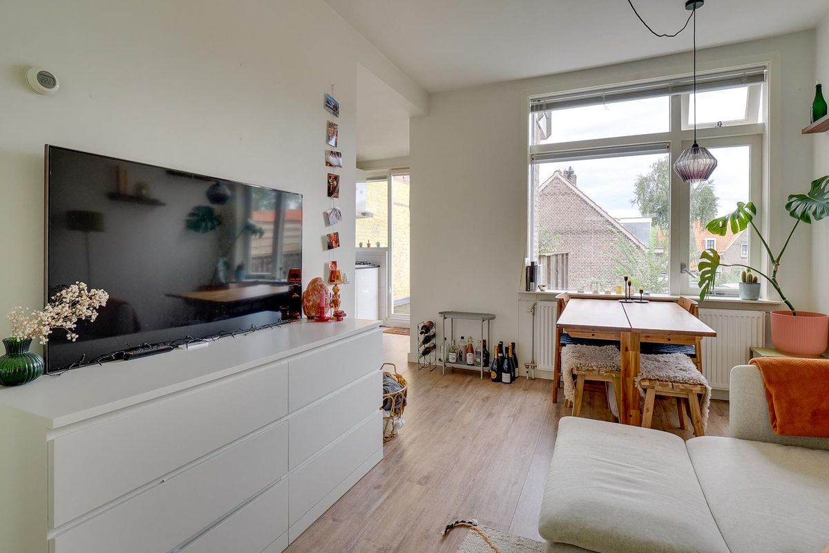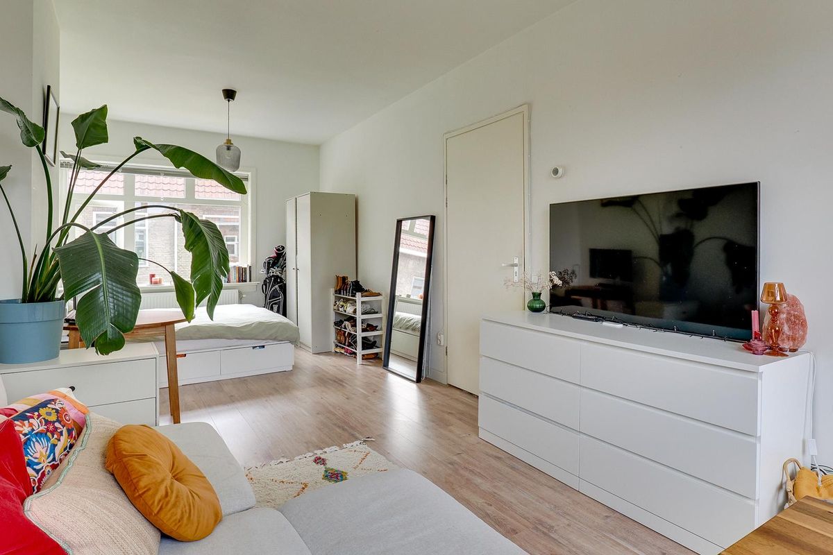 Doorzon woonkamer met aan de voorzijde een dakkapel en een dakraam. Aan de achterzijde van de woning is de open keuken gesitueerd welke voorzien is van diverse apparatuur. Naast de keuken is de buitendeur naar het dakterras. Naast de buitendeur is er een ruimte voor de c.v. opstelling. In het midden van de woonruimte is een badkamer gecreëerd welke beschikt over een toilet, een wastafelmeubel en een douche.