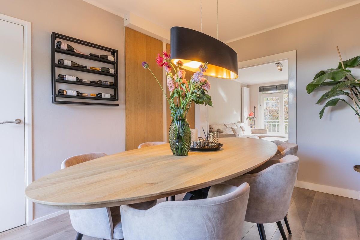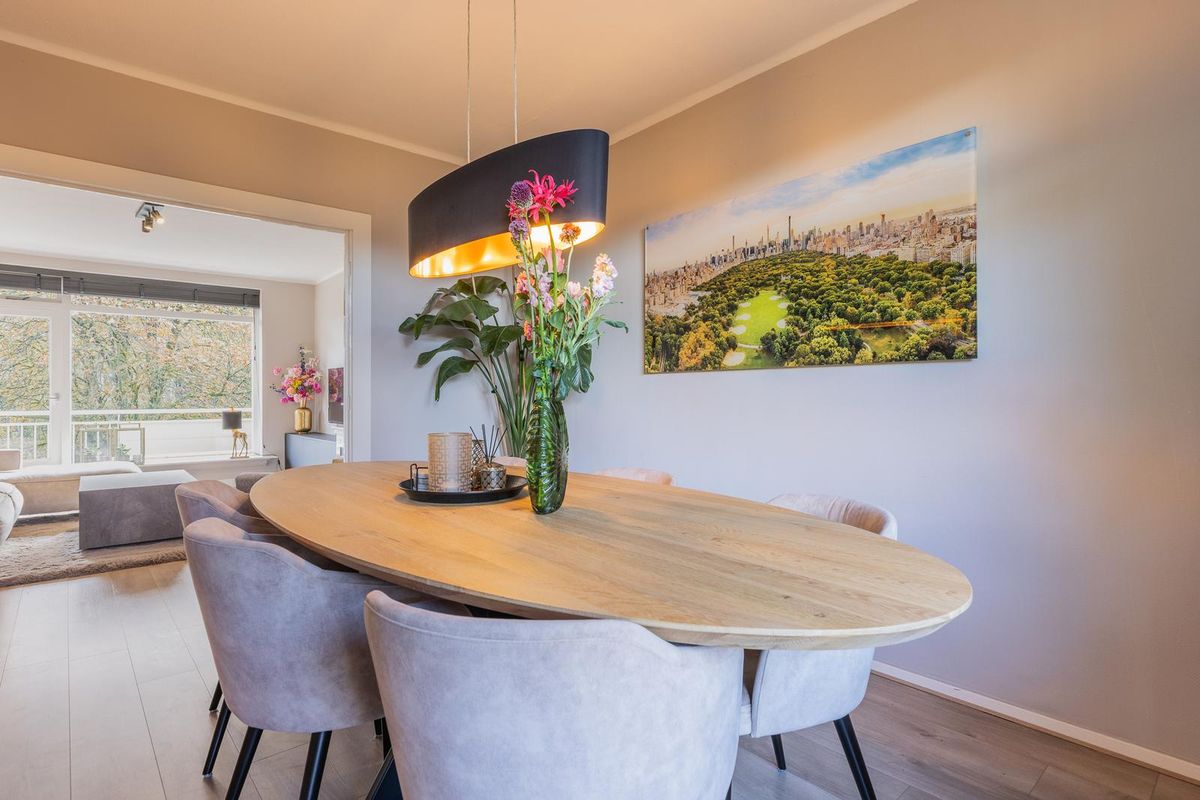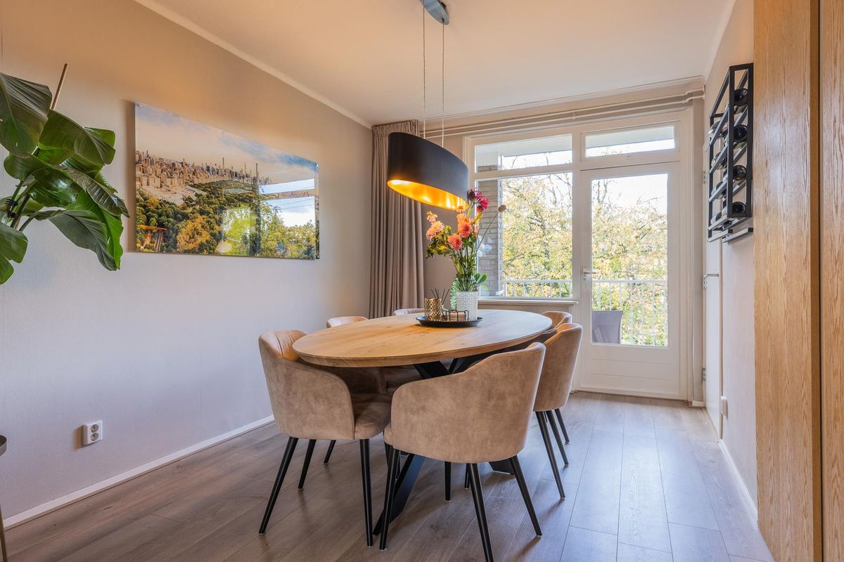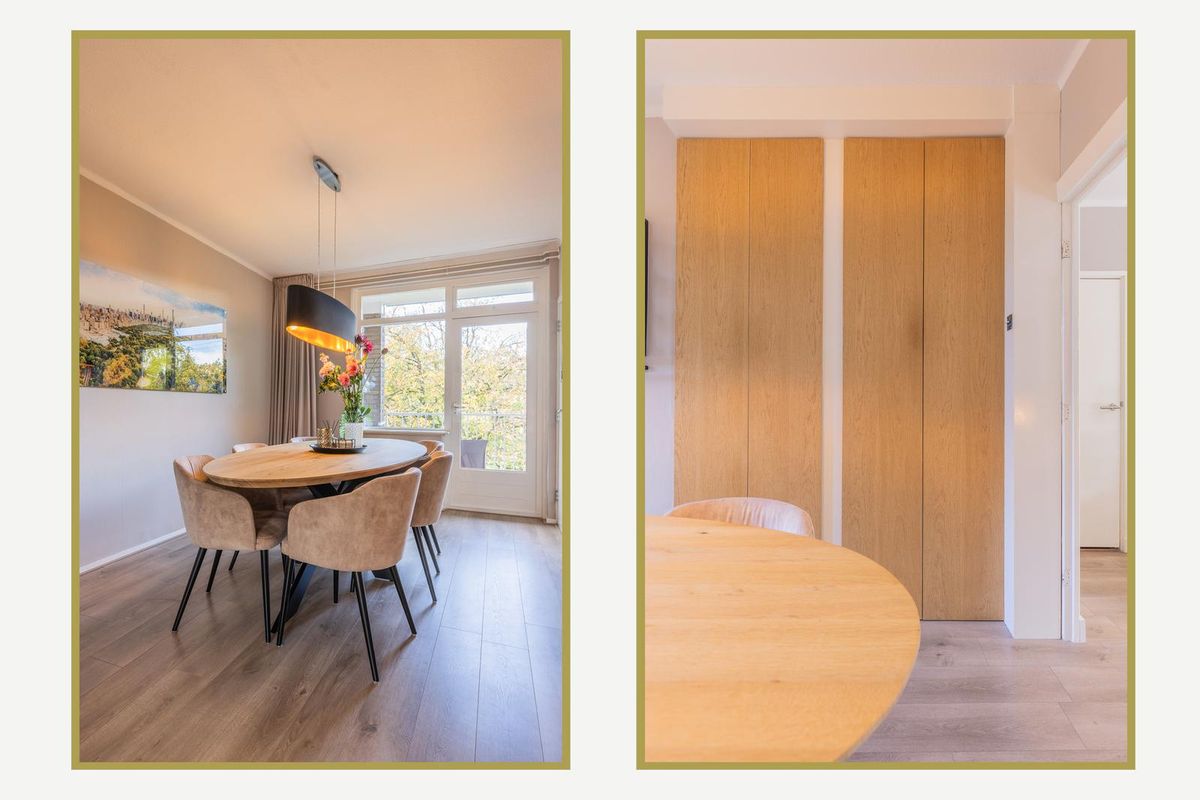 De eetkamer beschikt over twee op maat ingebouwde kasten met prachtige eikenhouten deuren en geeft toegang tot het balkon aan de achterzijde, gelegen op het noordwesten, met groen uitzicht en een praktische bergkast. Vanuit de eetkamer is er tevens toegang tot de badkamer. Deze moderne badkamer, gerenoveerd in 2025, is v.v. marmer-look wandtegels, een inloopdouche met regendouche, een wastafelmeubel met lades, een verlichte spiegel en een zwarte designradiator.