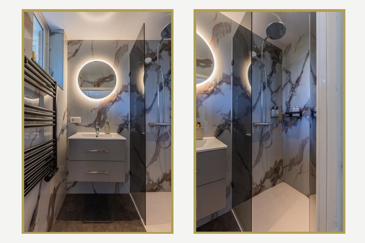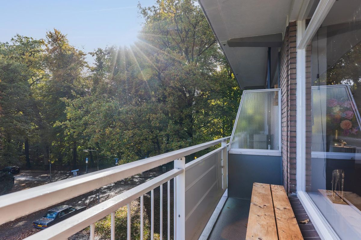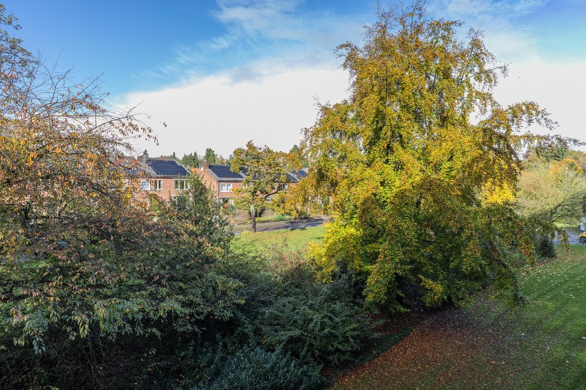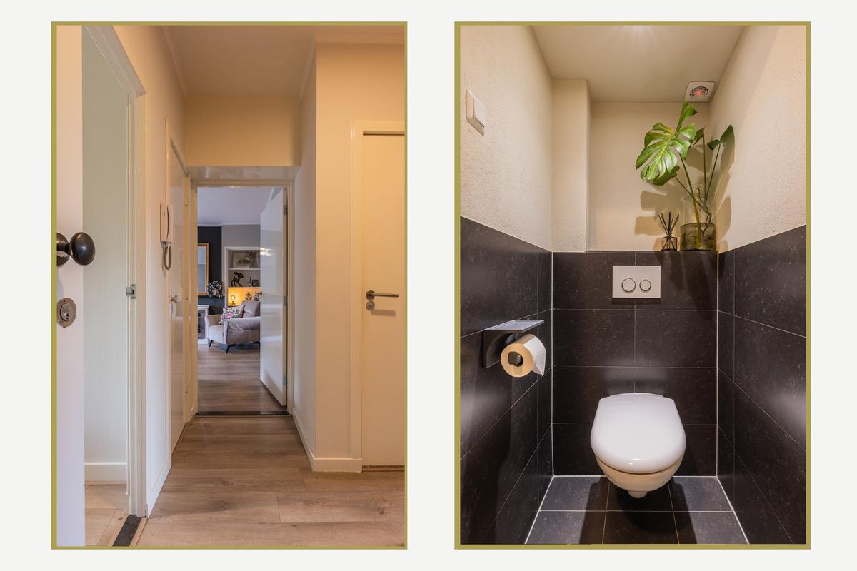 De eetkamer beschikt over twee op maat ingebouwde kasten met prachtige eikenhouten deuren en geeft toegang tot het balkon aan de achterzijde, gelegen op het noordwesten, met groen uitzicht en een praktische bergkast. Vanuit de eetkamer is er tevens toegang tot de badkamer. Deze moderne badkamer, gerenoveerd in 2025, is v.v. marmer-look wandtegels, een inloopdouche met regendouche, een wastafelmeubel met lades, een verlichte spiegel en een zwarte designradiator.