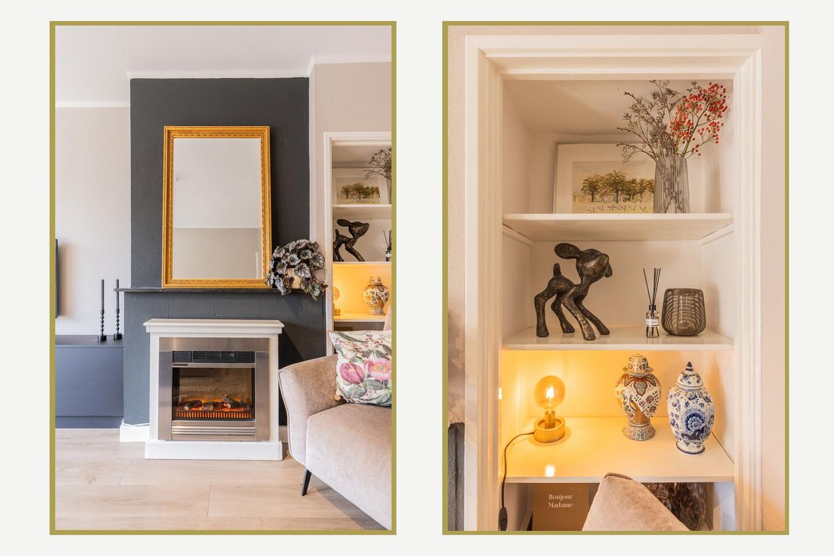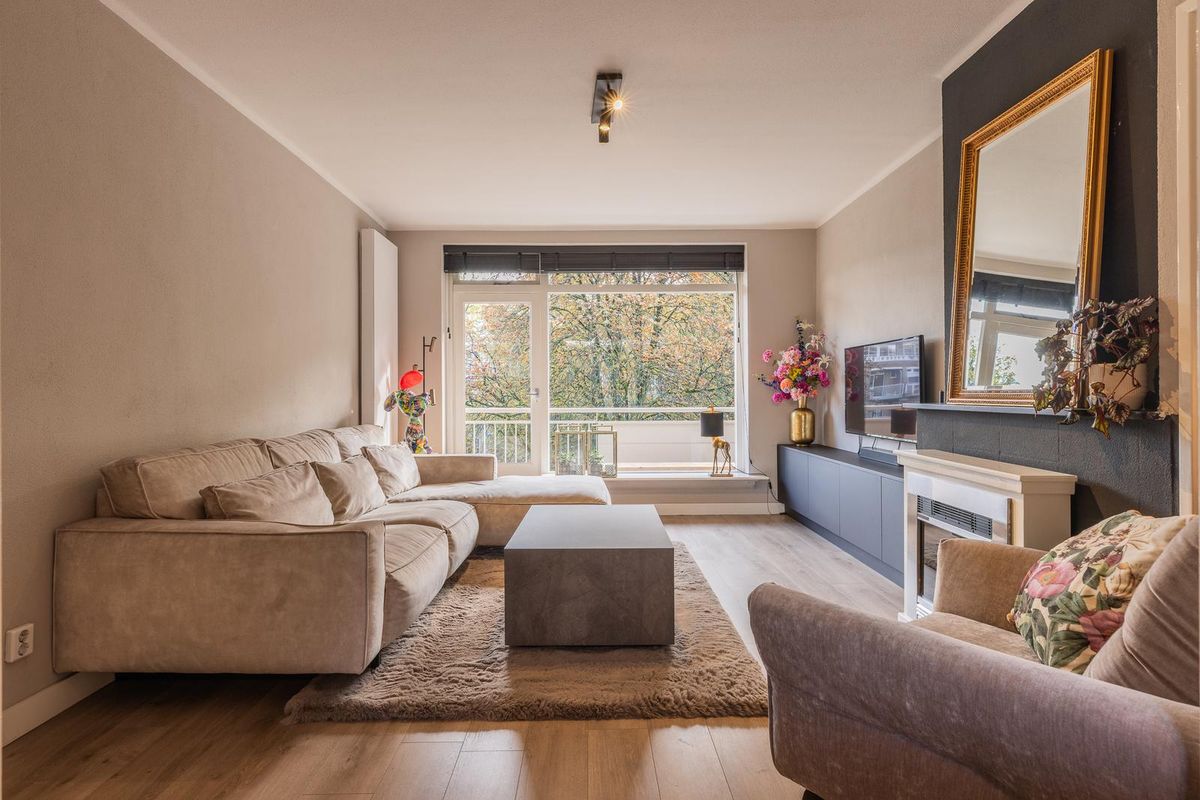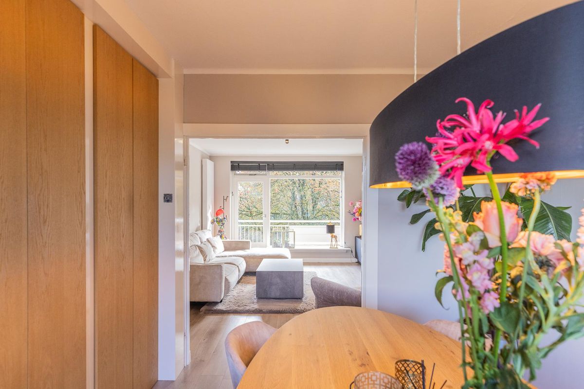 De woonkamer-en-suite met grote raampartijen is heerlijk licht, biedt voldoende ruimte voor een grote hoekbank, is voorzien van een maatwerk tv meubel, een vaste kast, een moderne verticale radiator en een schouwpartij. De woonkamer biedt toegang tot het balkon aan de voorzijde, gelegen op het zuidoosten, met prachtig uitzicht op het groene straatbeeld en de ingang van Park Angerenstein.