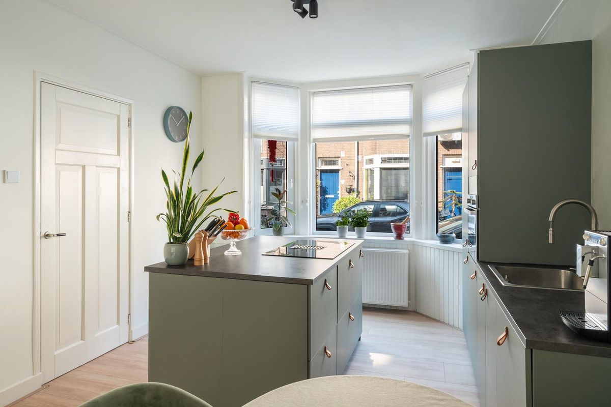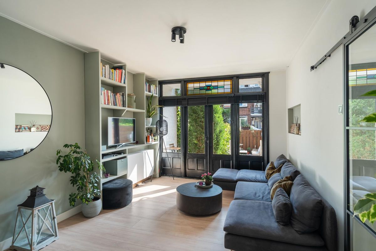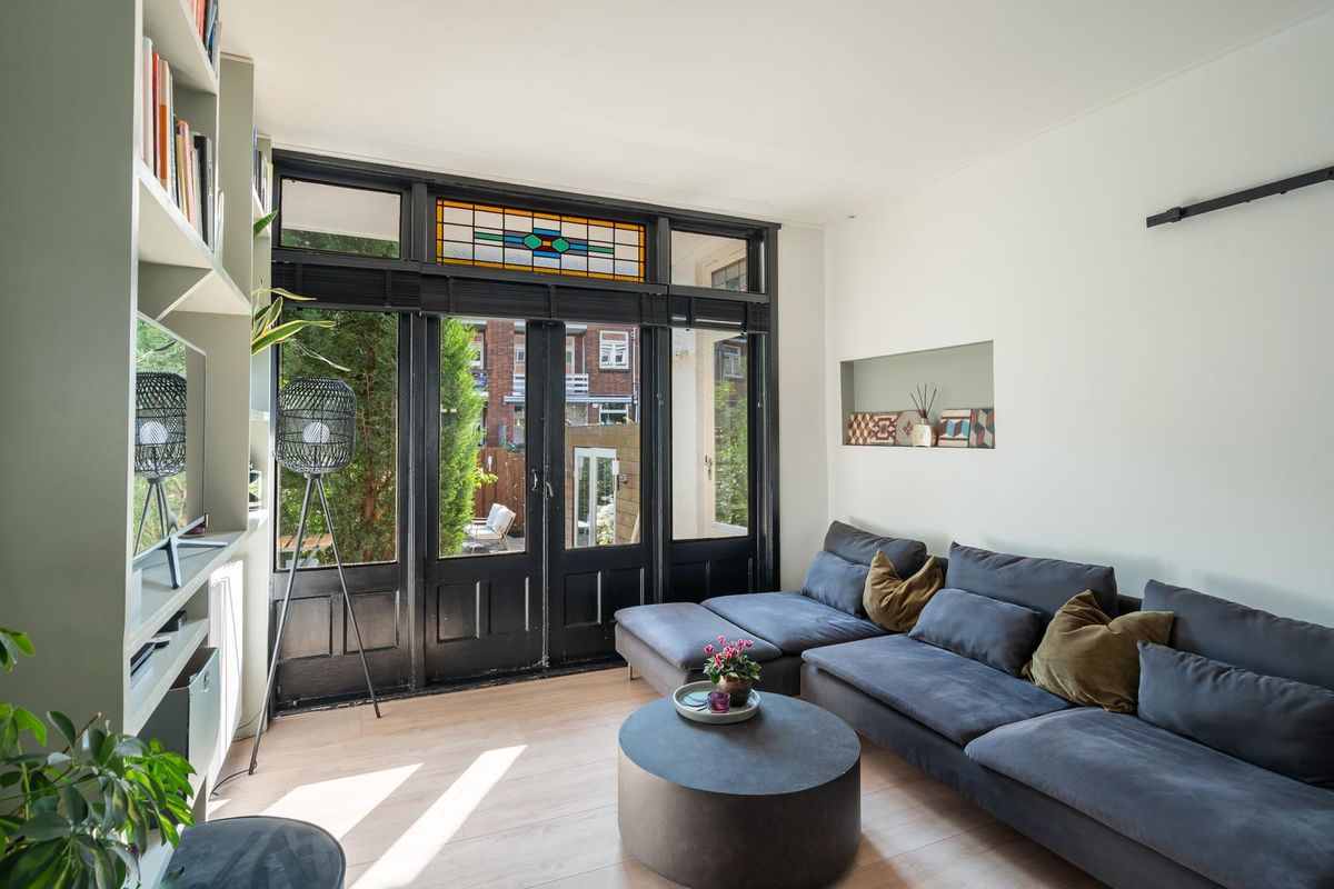 De lichte en ruime woonkamer strekt zich uit van voor- tot achterzijde en heeft authentieke details, zoals openslaande deuren naar de tuin, paneeldeuren en glas-in-lood bij de entree. Via de klassieke tuindeuren stap je op het beschutte terras, waar je al vroeg in het seizoen in de ochtendzon van je eerste kop koffie kunt genieten.