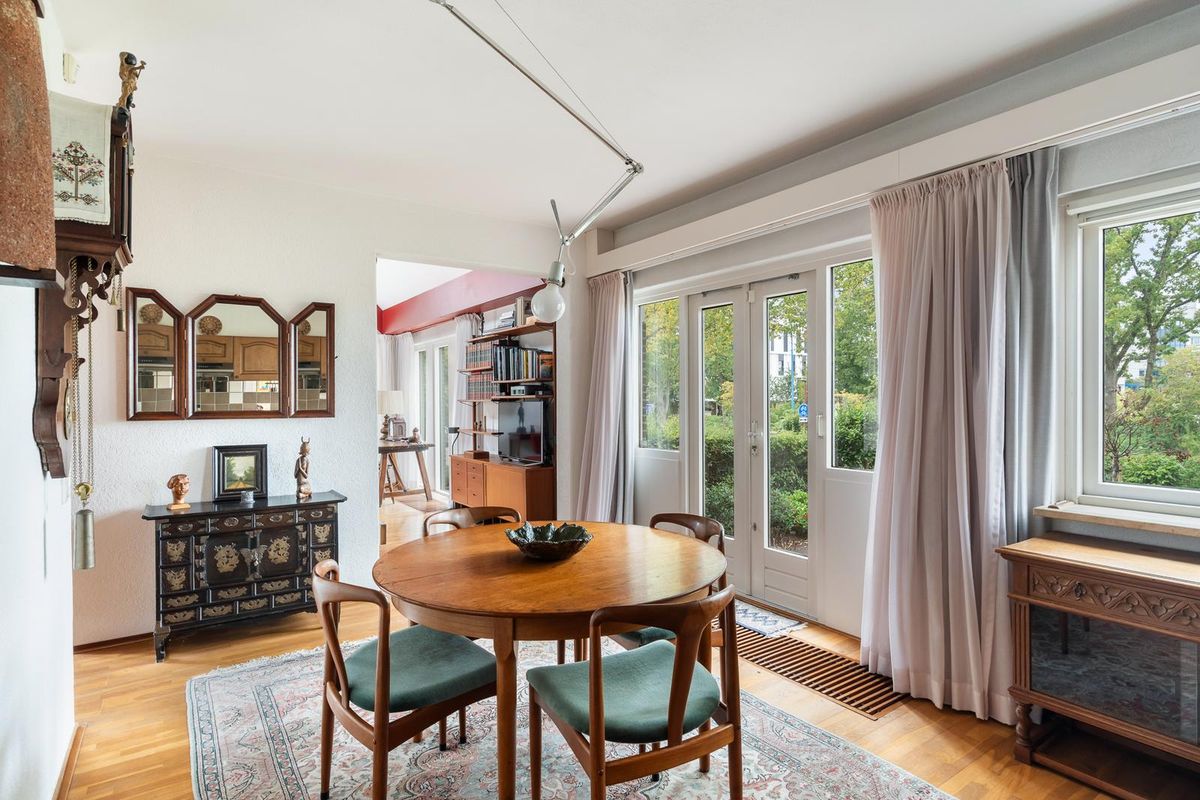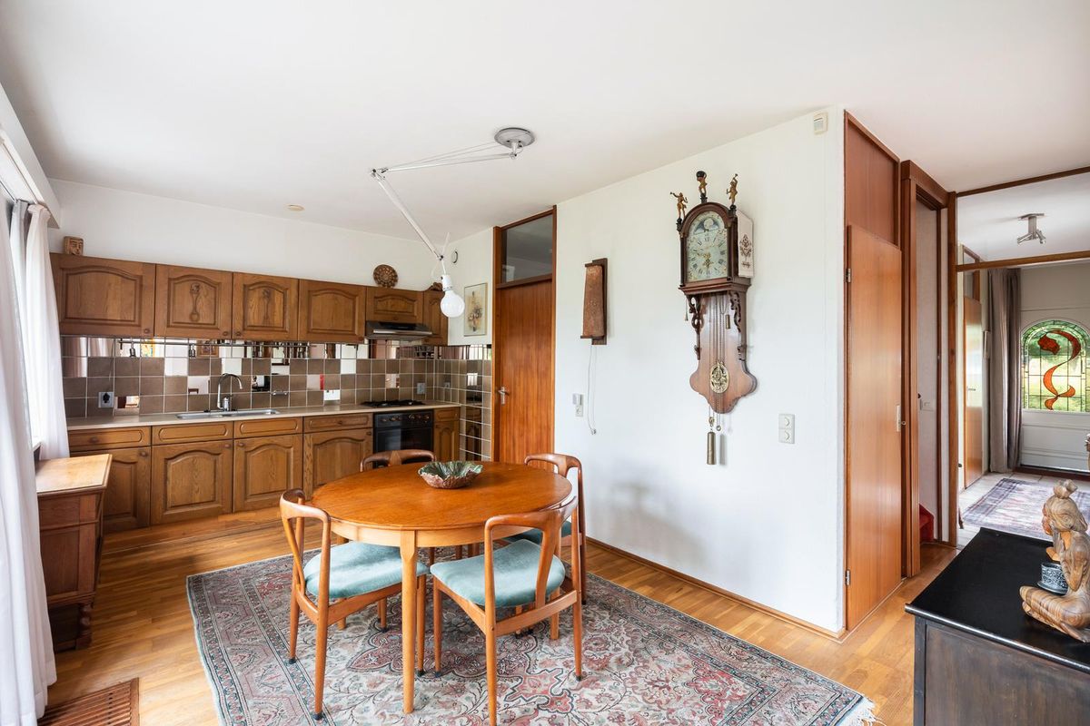 De open keuken dateert uit het bouwjaar van de woning en is geheel naar eigen zin te moderniseren. Zie je hier al een moderne keuken voor je, met misschien wel een kookeiland? De naastgelegen bijkeuken zorgt voor veel extra bergruimte en hier is een aansluiting voor de wasmachine. Vanuit de eetkamer en keuken stap je via de openslaande deuren de achtertuin in.