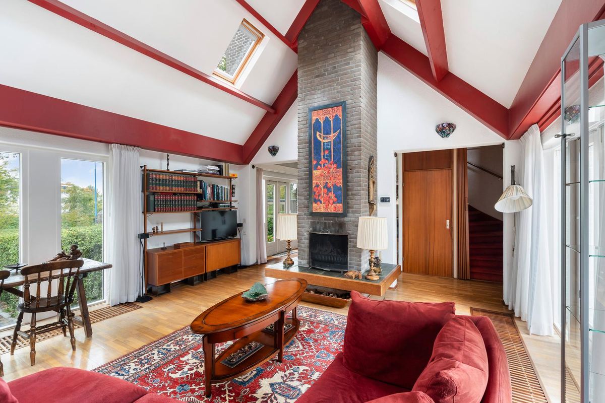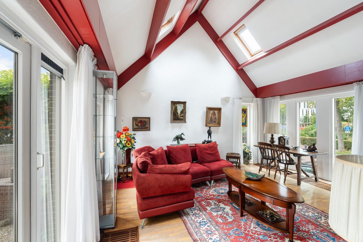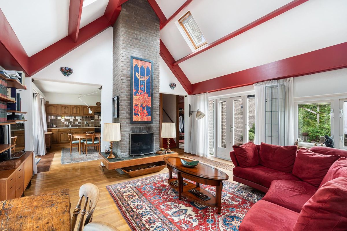 Overdekt entree met toegang naar de voortuin, garage en woning. De garage op straatniveau is voorzien van een kunststof elektrische deur, elektra en een uitstortgootsteen met kraan. Ruime hal met meterkast, garderobe en toiletruimte, voorzien van hangend toilet met fonteintje. Toegang naar de eetkamer met aangrenzend de woonkamer, waarbij het hoge plafond met Velux dakvensters meteen in het oog springt. Dit geeft niet alleen een speels effect, maar ook veel lichtinval en een huiselijk gevoel. Aan 3 zijden van de woonkamer zitten raampartijen, zodat er veel zon- en lichtinval is, en openslaande deuren geven toegang tot de patiotuin. Er is een haardkanaal met gashaard aanwezig, welke als afscheiding dient naar de eetkamer met open keuken. Kinderen kunnen hier naar hartenlust rondjes rennen!