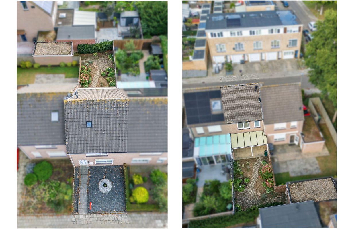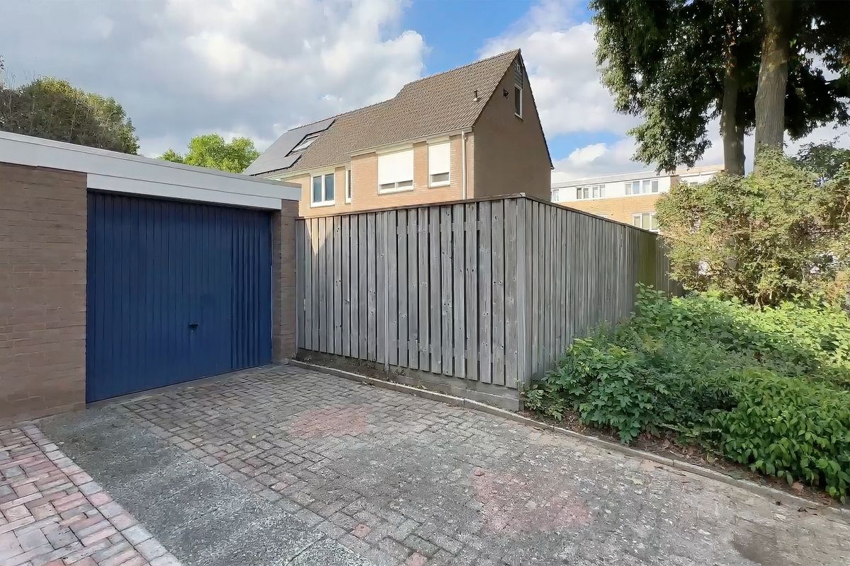 De onderhoudsvriendelijke achtertuin is deels betegeld, voorzien van enkele beplantingen en biedt toegang tot de achtergelegen garage. Deze stenen garage is uitgevoerd met een kantelpoort, ideaal voor de auto, als opslag of werkruimte. Voor de garage ligt een ruime oprit met ruimte voor twee auto’s.