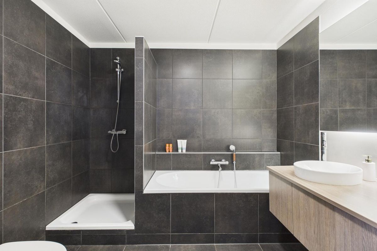 Op de eerste verdieping bevinden zich de overloop, twee royale slaapkamers en een praktische berging/stookruimte. Beide slaapkamers strekken zich uit over de volledige breedte van de woning, waardoor ze opvallend ruim en licht zijn. Door de overloop iets uit te breiden, is er eenvoudig een derde slaapkamer te realiseren. De moderne badkamer is netjes afgewerkt en beschikt over een ligbad, douche, wastafelmeubel en tweede toilet.
