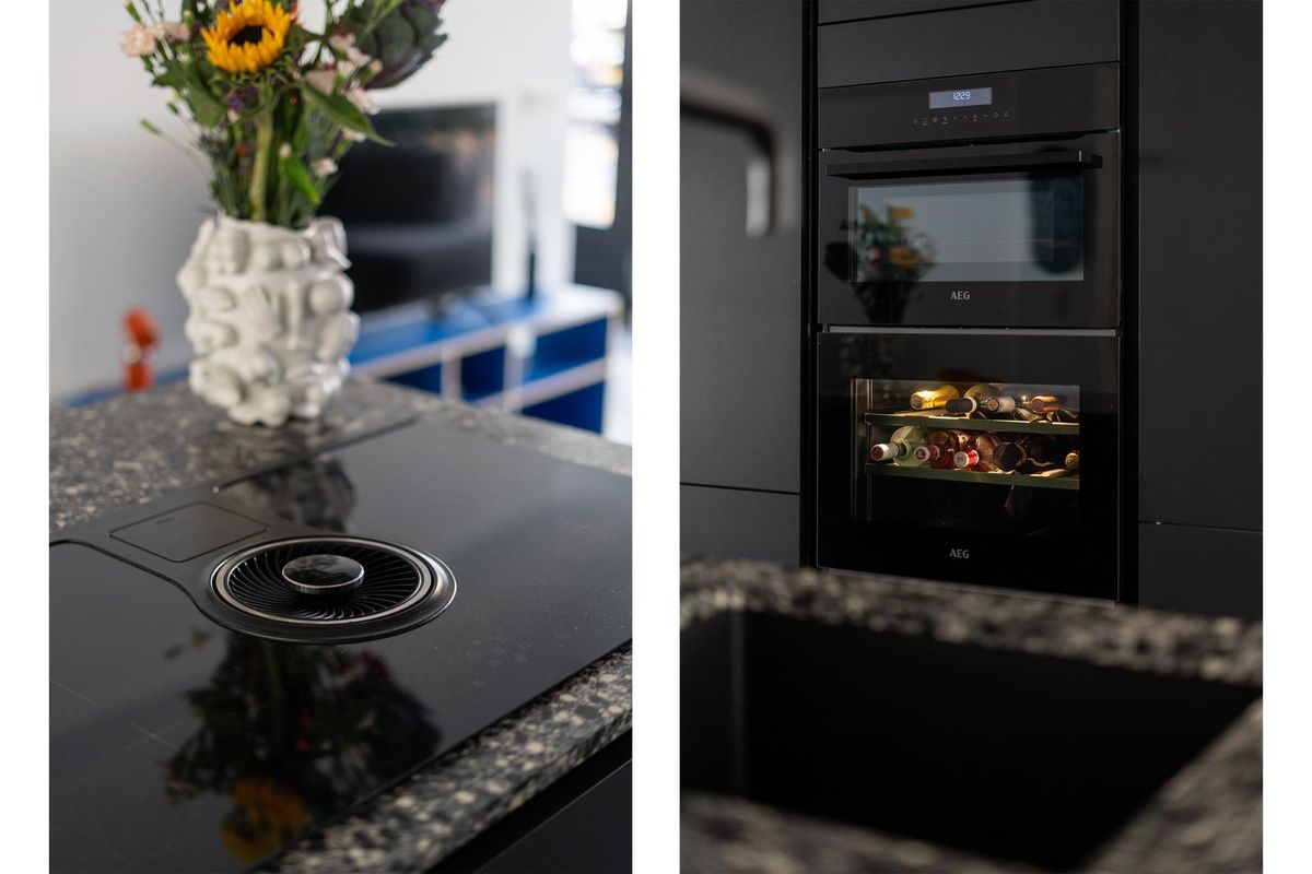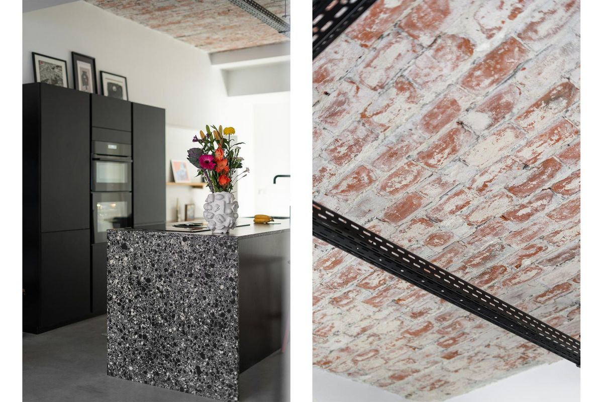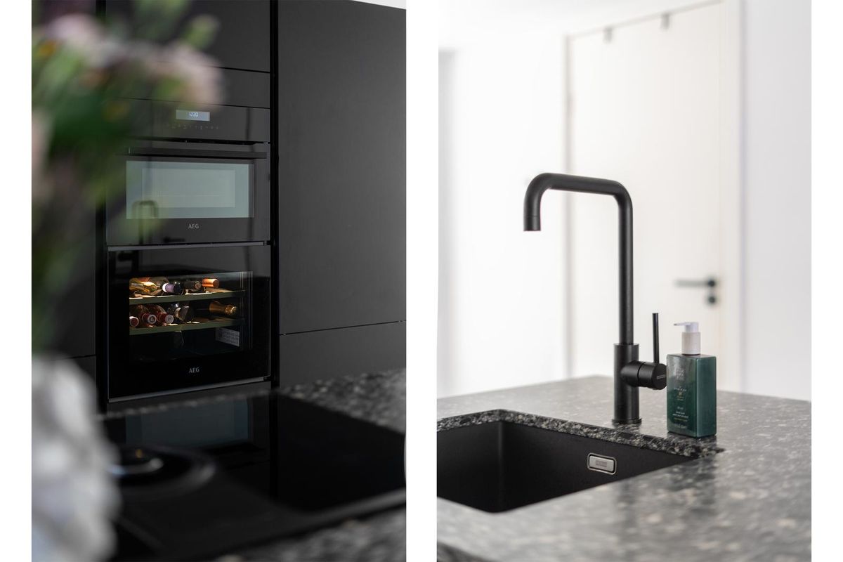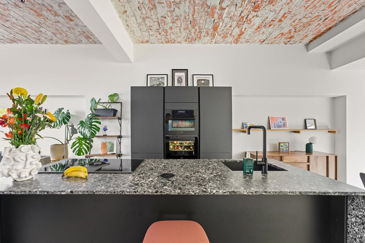 Via de entree kom je in de hal, vanwaar je met een opstapje en een industriële stalen deur het indrukwekkende leefgedeelte betreedt. De brick ceiling, betonnen vloer en zwarte kozijnen zorgen voor een stoere en luxe uitstraling. De woonkamer is royaal opgezet en wordt aan de voorzijde gekenmerkt door grote raampartijen met uitzicht op de kade, waardoor het geheel extra ruimtelijk oogt en een fijne lichtinval heeft. Centraal in de ruimte bevindt zich de open keuken met kookeiland. De matzwarte afwerking in combinatie met een zwart-wit vlokken composiet werkblad geeft een trendy en moderne uitstraling. De keuken is voorzien van alle gemakken, waaronder een inductiekookplaat met geïntegreerde afzuiging, combi-oven, koel-vriescombinatie, wijnkoelkast, vaatwasser en volop opbergruimte.