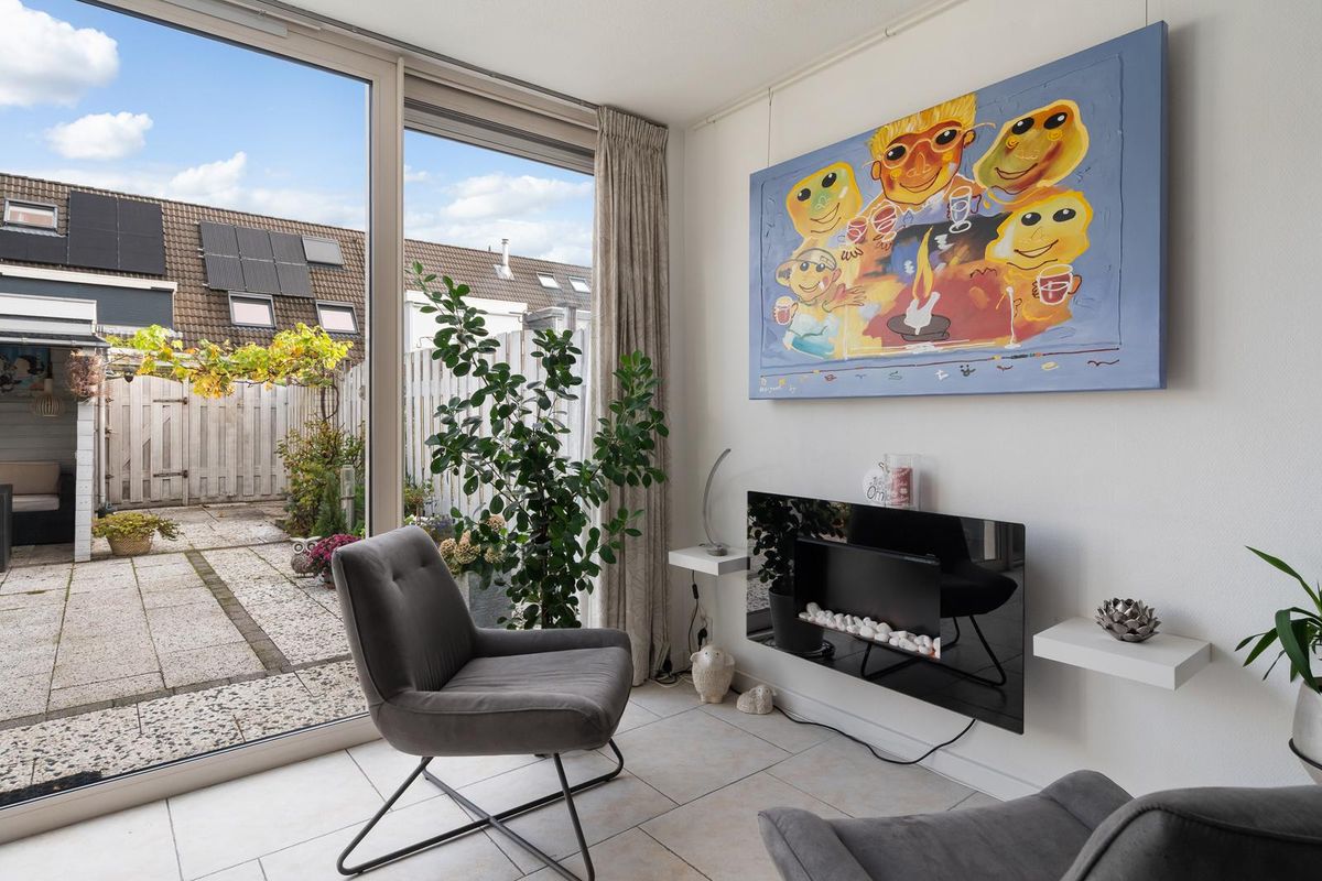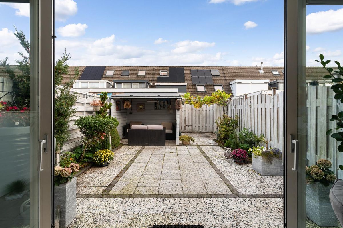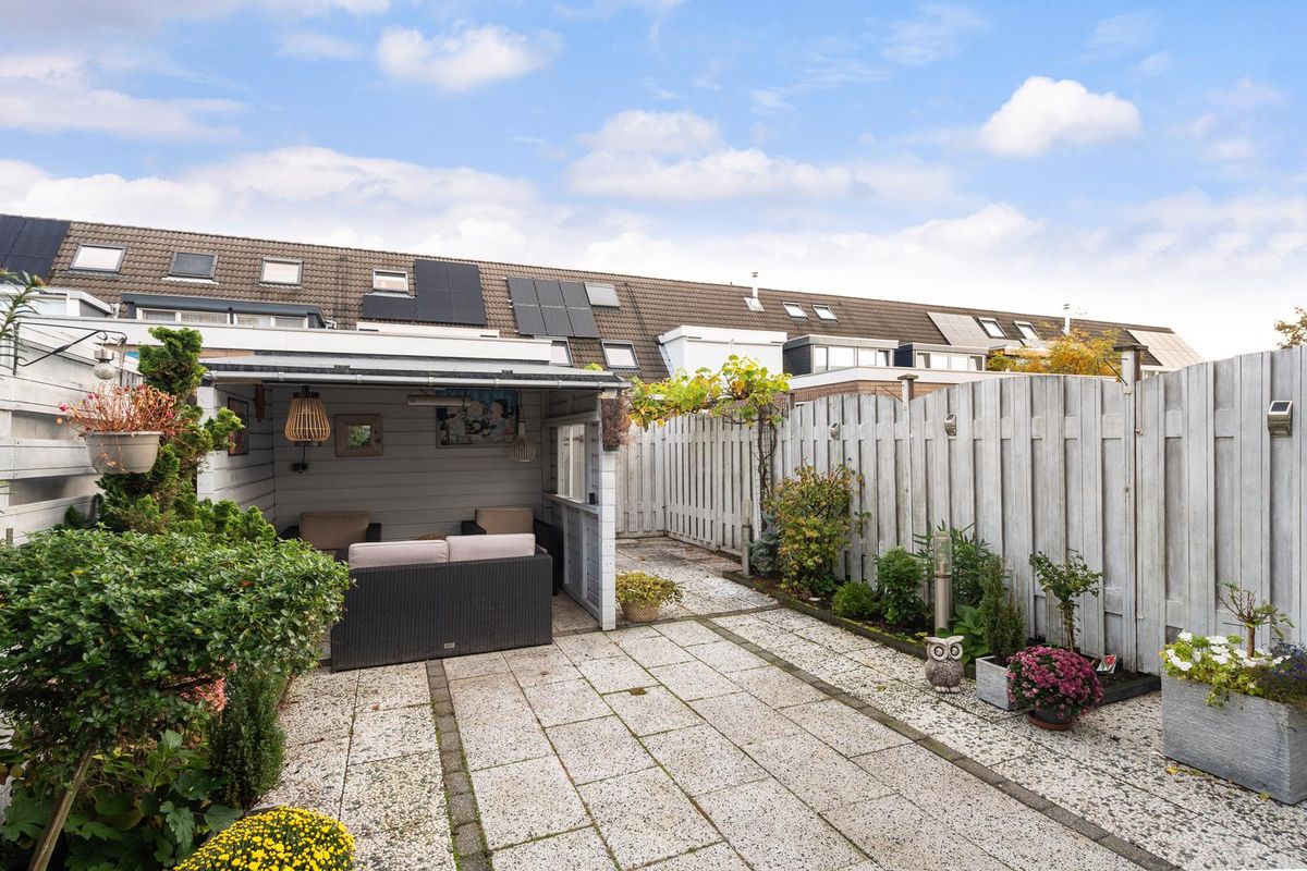 Via de aluminium schuifpui is de achtertuin bereikbaar, die grotendeels betegeld is, met groenborders aan de zijkanten. Achterin staat de vrijstaande stenen berging met aangebouwde houten overkapping. Dit is een fijne plek waar je al snel buiten kunt zitten en waar ook elektra aanwezig is. De tuin is ook bereikbaar via een achterom. Zowel aan de voor- als de achterzijde van de woning is een buitenkraan.