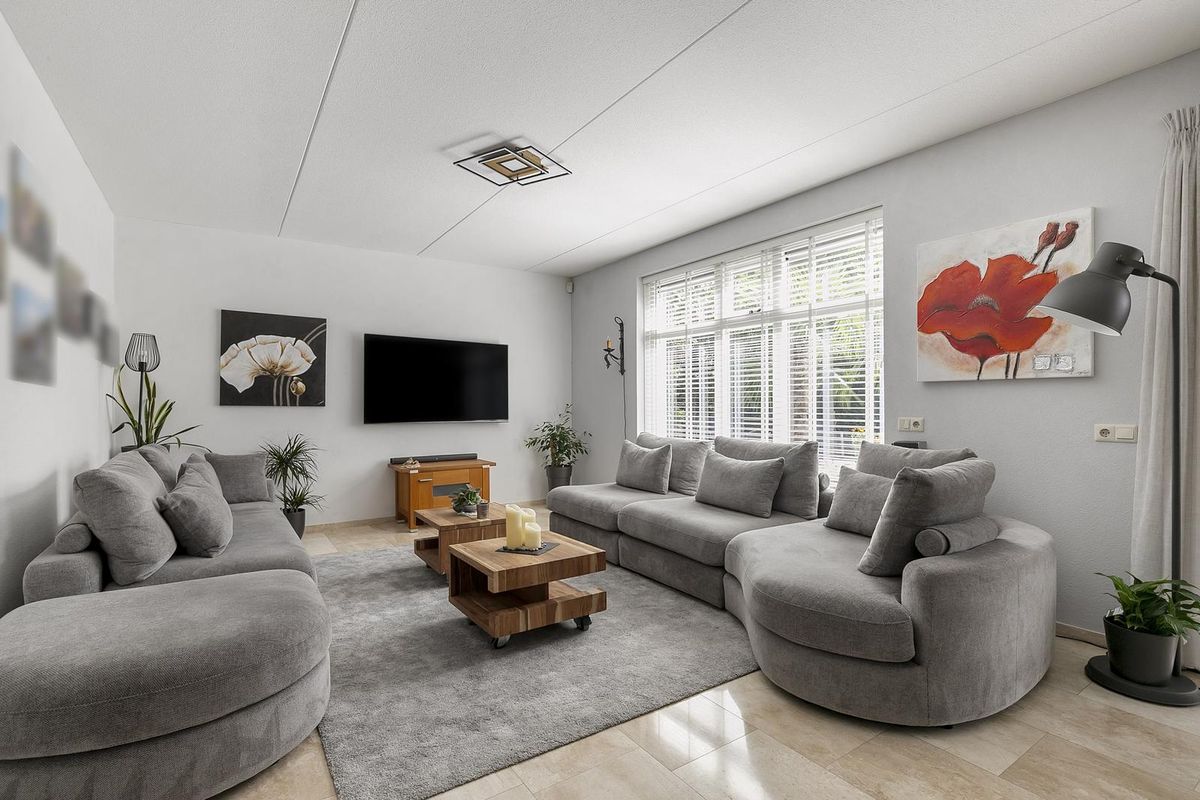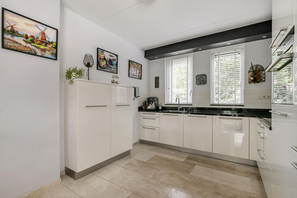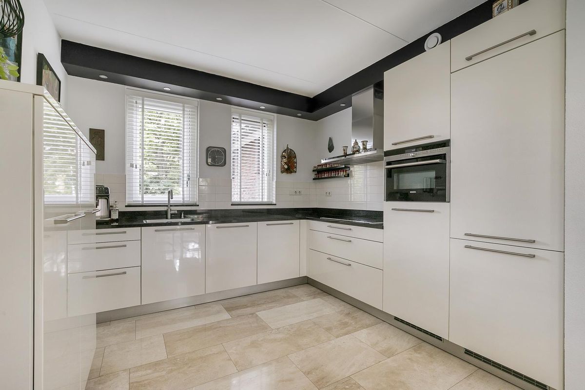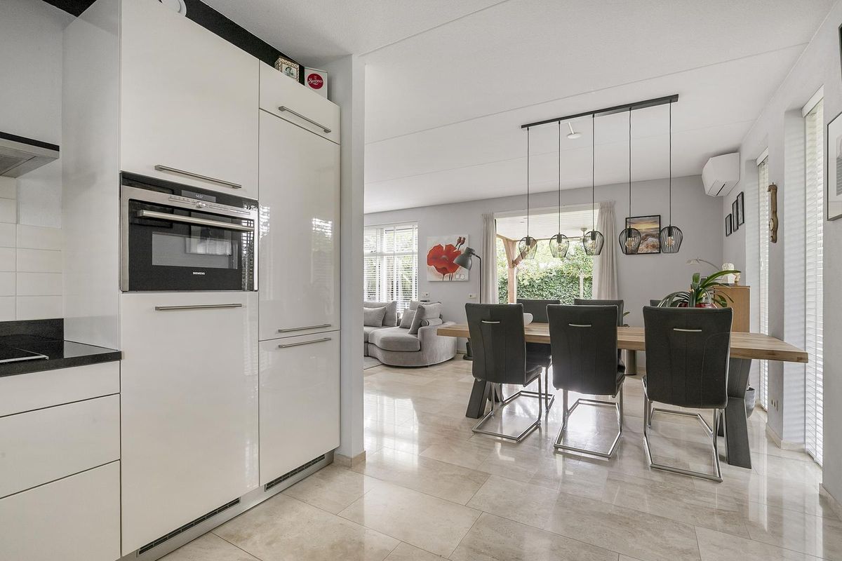Een stijlvolle houten deur met stalen look leidt naar de woonkamer. Hier geniet je van een fijne zithoek, veel lichtinval en openslaande deuren naar de achtertuin. Voor extra comfort zijn er een elektrisch screen en airconditioning (2023) aanwezig. Dankzij de aanwezige gasleiding is het bovendien eenvoudig om een sfeervolle open haard te realiseren. De open L-vormige keuken in hoogglans crème biedt volop kastruimte en is uitgerust met alle benodigde inbouwapparatuur, waaronder een vaatwasser, combi-oven, inductiekookplaat met warmhoudfunctie, afzuiger, koelkast en vriezer.