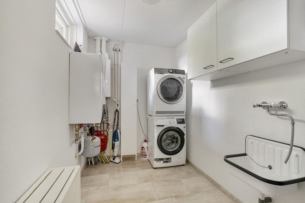 De wasruimte/bijkeuken is praktisch ingericht met een extra wasbak, aansluitingen voor je witgoed en ruimte voor de technische installaties, waaronder de nieuwe cv-ketel (Remeha Tzerra Ace-Matic 35C, 2025) en de hybride warmtepomp. Op de begane grond vind je daarnaast een extra (slaap)kamer, ideaal te gebruiken als werk-, hobby- of logeerkamer. Dankzij de ramen tot op de vloer geniet je hier van veel lichtinval. Aangrenzend ligt een extra badkamer met een inloopdouche en wastafel.