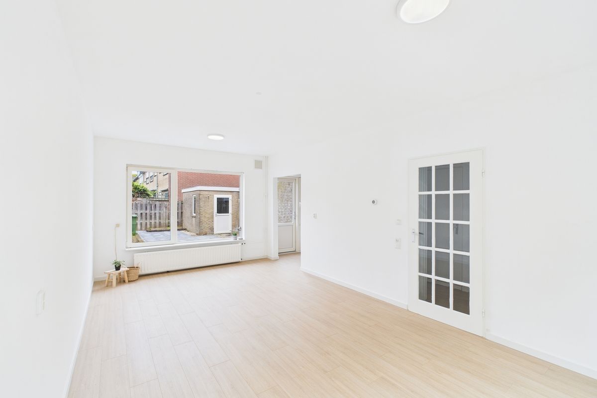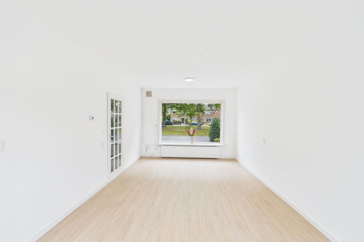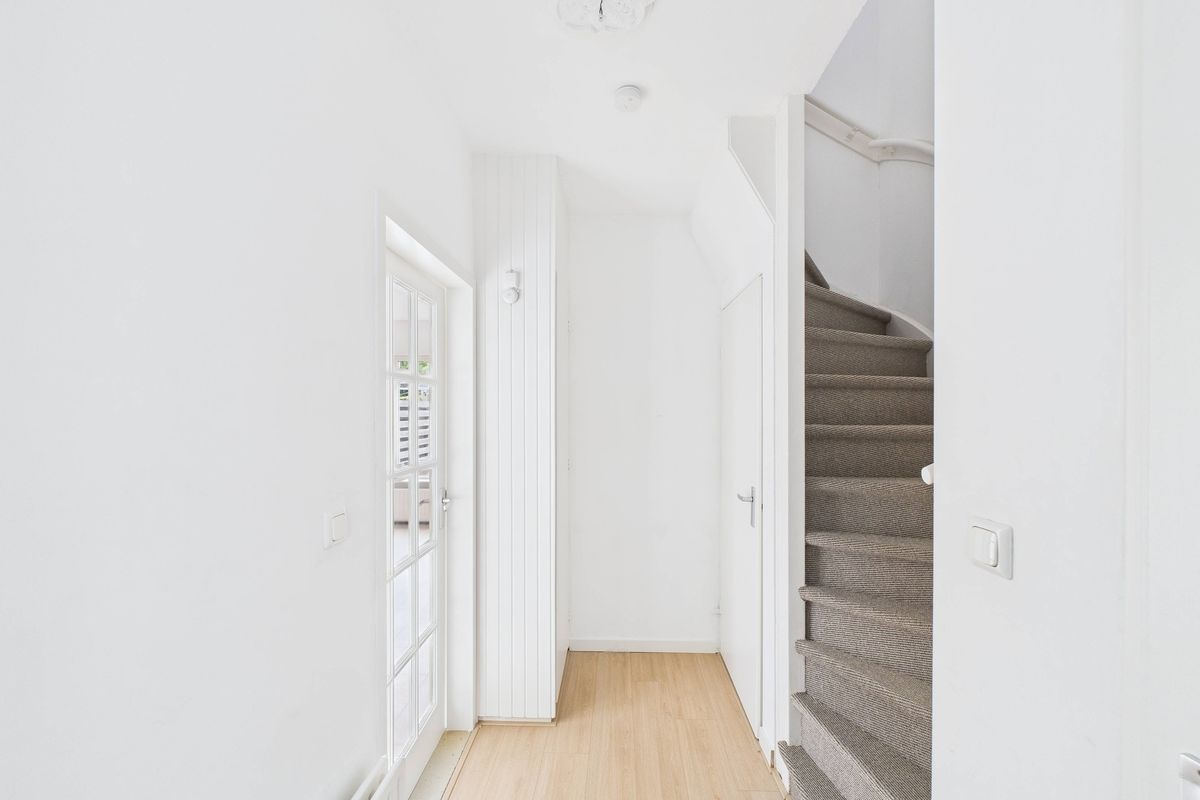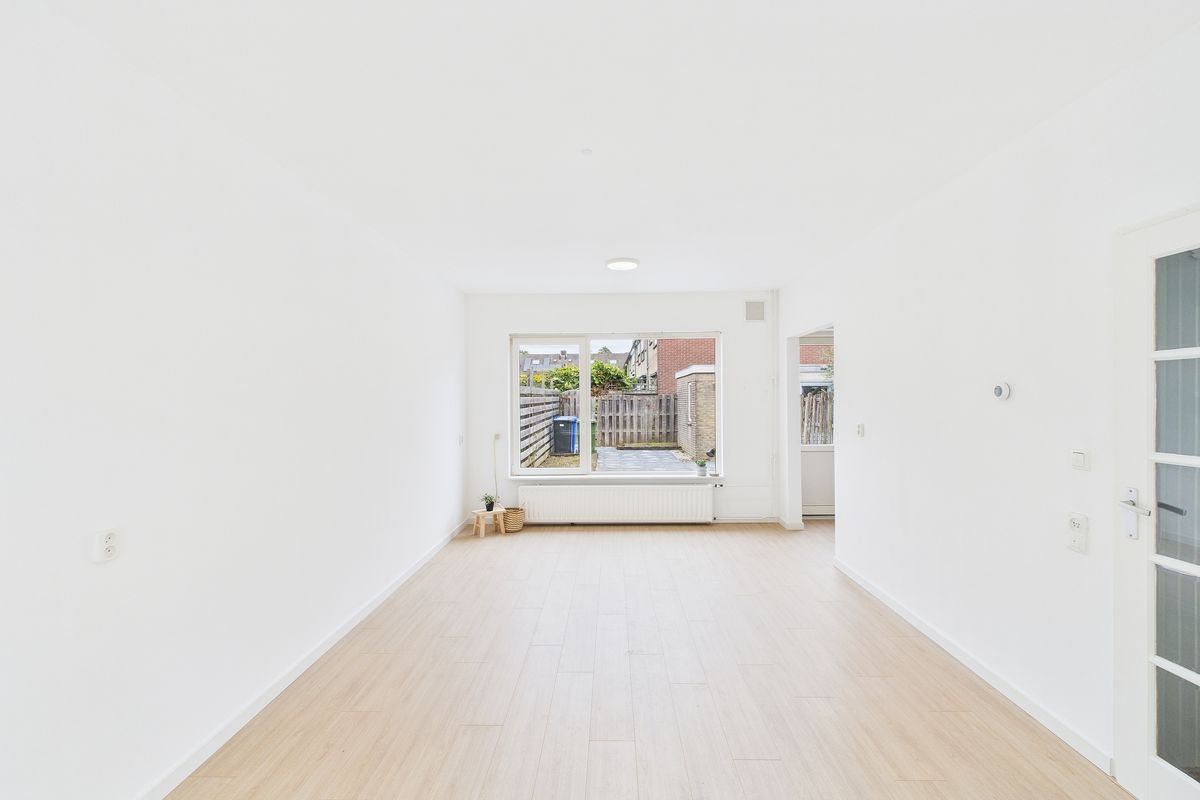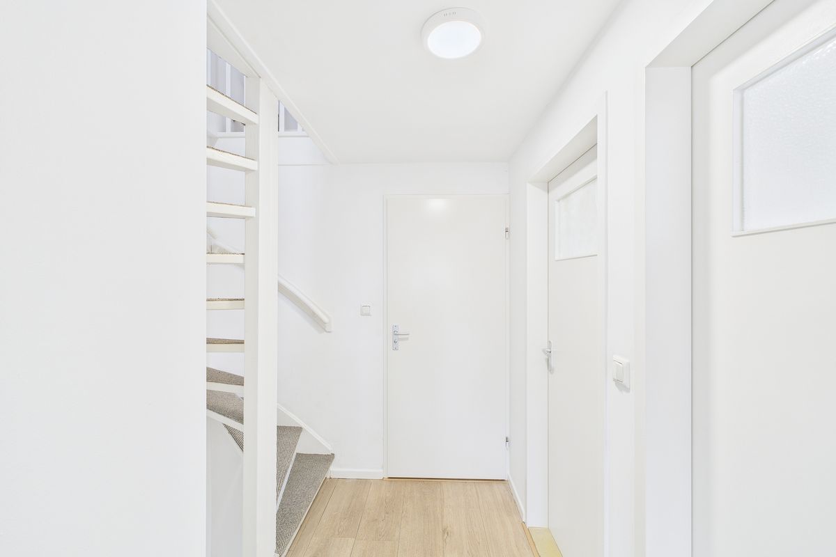 Ruime inkomhal met toegang tot de woonkamer, toilet, meterkast en trapkast. De woonkamer is heerlijk licht en afgewerkt met een nette laminaatvloer. Aansluitend vind je de moderne keuken, die volledig is vernieuwd en uitgerust met alle benodigde inbouwapparatuur zoals een vaatwasser, oven, inductiekookplaat en afzuigkap.