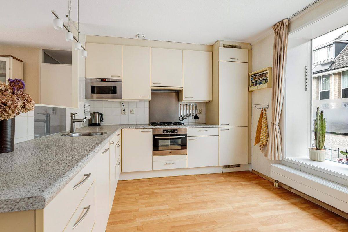 Aan de voorzijde bevindt zich de ruime open keuken (ca. 18 m²), uitgevoerd in een lichte kleurstelling met kunststof aanrechtblad. De keuken is opgesteld in een hoek en voorzien van een koel/vriescombinatie, oven, magnetron, vaatwasser en een 4-pits gaskookplaat met geïntegreerde afzuiging. De uitbouw aan de zijkant geeft een speels effect en zorgt voor extra wooncomfort. Door deze extra ruimte is er plaats genoeg voor een gezellige eethoek.
