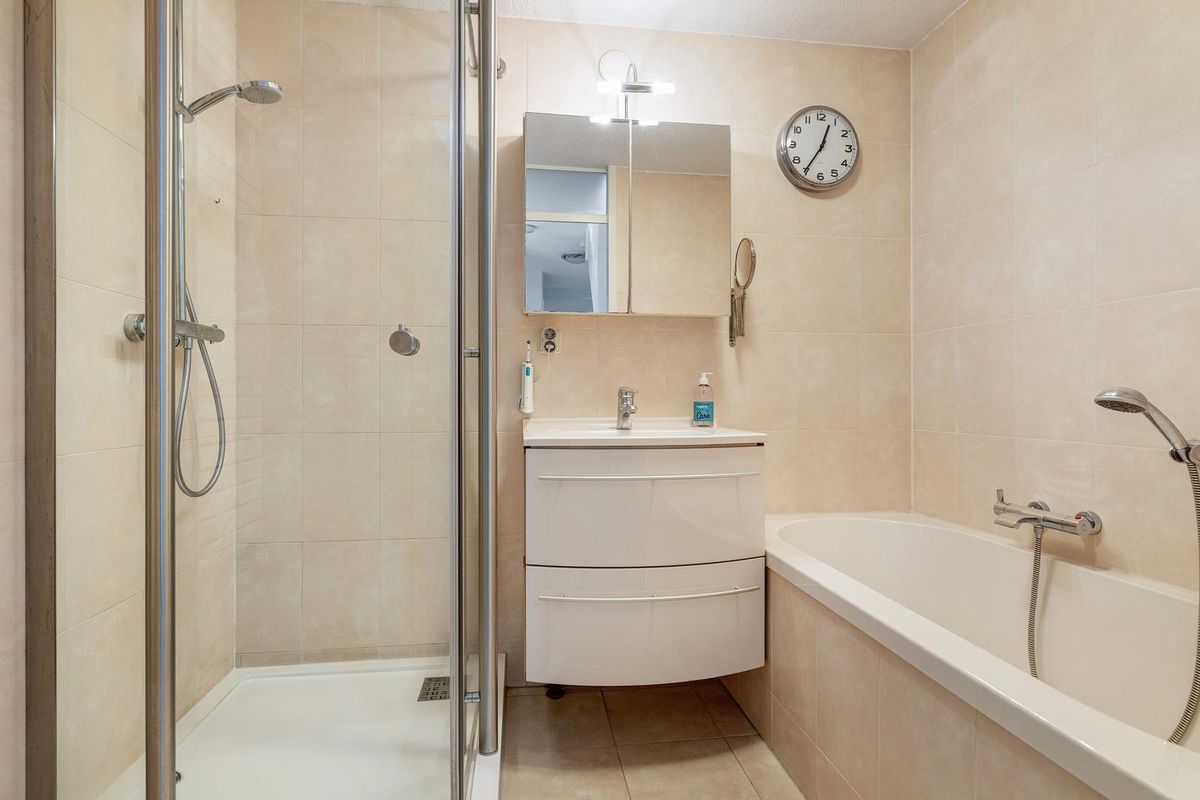 De badkamer (ca. 4 m²) is compleet uitgevoerd met een ligbad, een aparte douchecabine en een wastafelmeubel. Geheel betegeld in een neutrale beige kleurstelling.