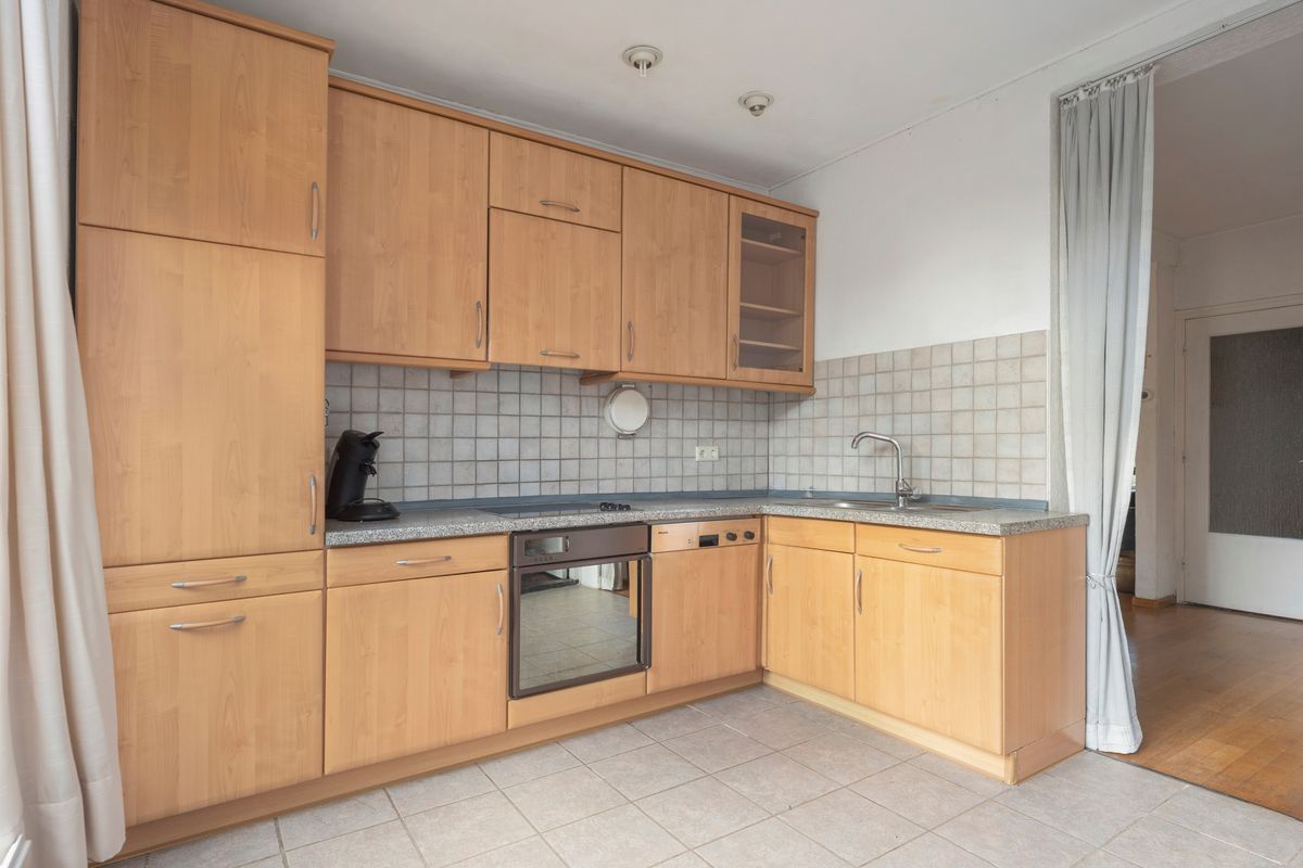 Halfopen keuken welke voorzien is van een koelkast, elektrisch fornuis, afzuigkap en ene vaatwasser.