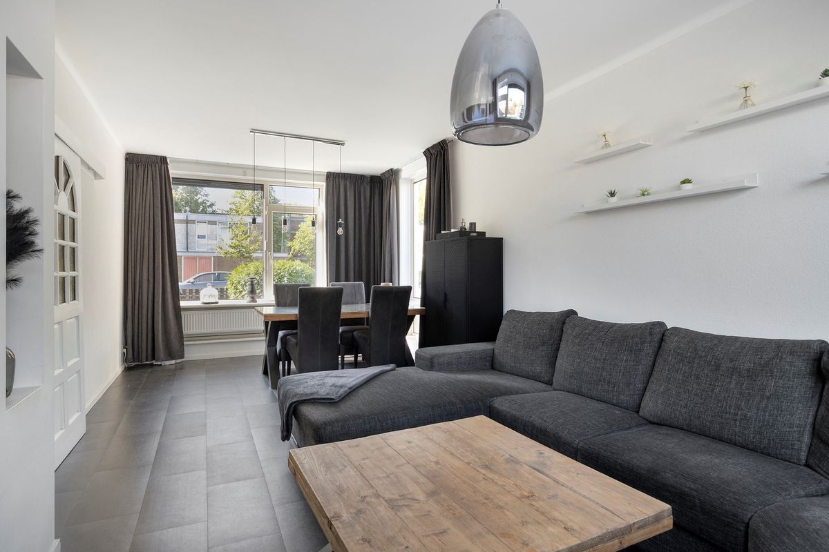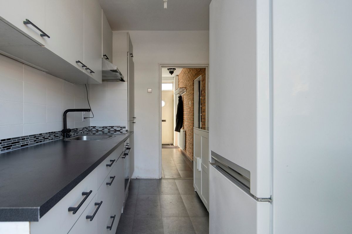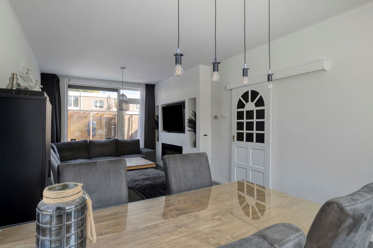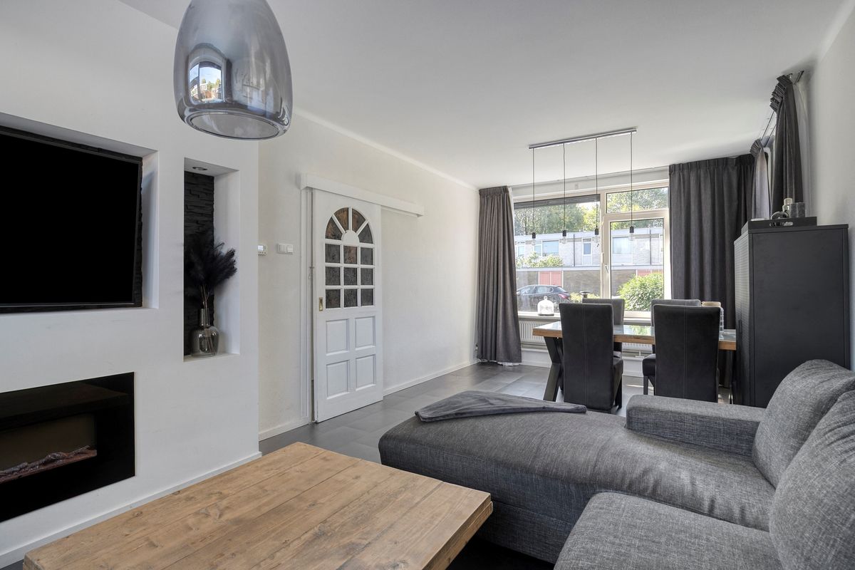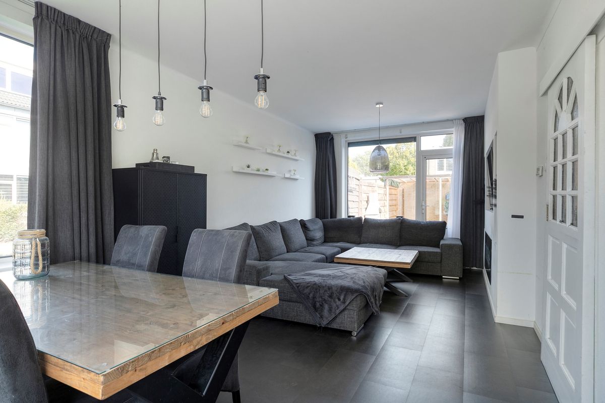 Wanneer u de woning binnenkomt, valt direct de verzorgde entree op. In de hal vindt u de meterkast, de trapopgang naar boven en een modern toilet met hangend closet, volledig betegeld in een strakke stijl. De keuken bevindt zich aan de achterzijde van de woning en is praktisch ingericht met een inductiekookplaat, afzuigkap en een kunststof werkblad. Vanuit hier loopt u zo de achtertuin in. De woonkamer is een echte eyecatcher: dankzij de ramen aan de zijkant stroomt het daglicht hier rijkelijk naar binnen. De ruimte is afgewerkt met een pvc-vloer en strakke wanden, en de gezellige zithoek met cinema wall en ingebouwde elektrische haard zorgt voor een warme en moderne uitstraling. Vanuit de woonkamer bereikt u eveneens de tuin, waardoor binnen en buiten prettig met elkaar verbonden zijn.