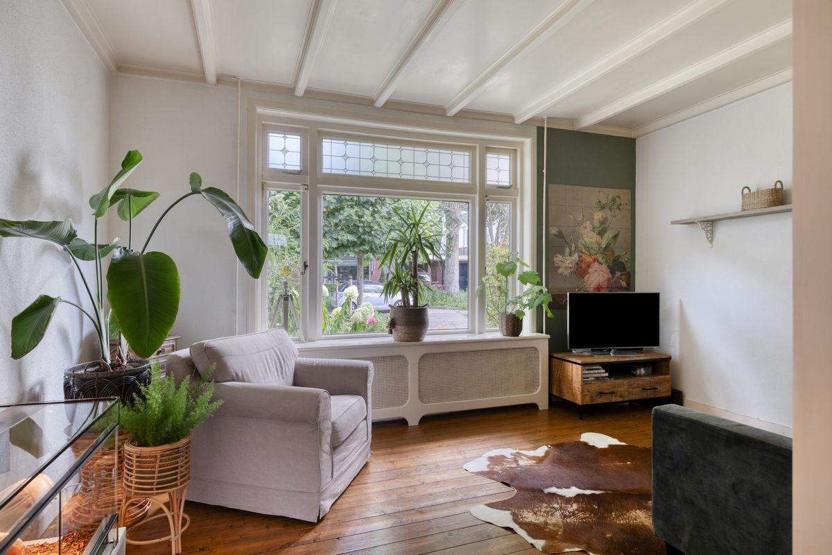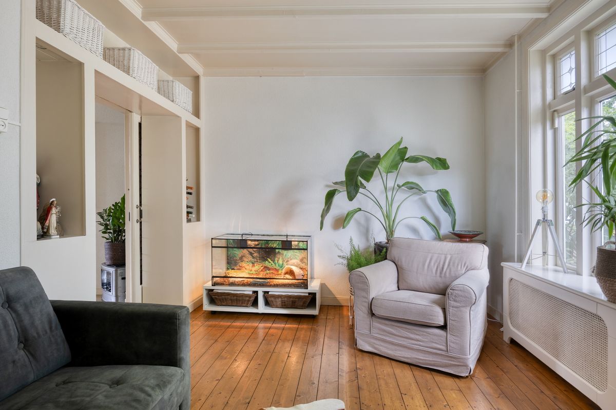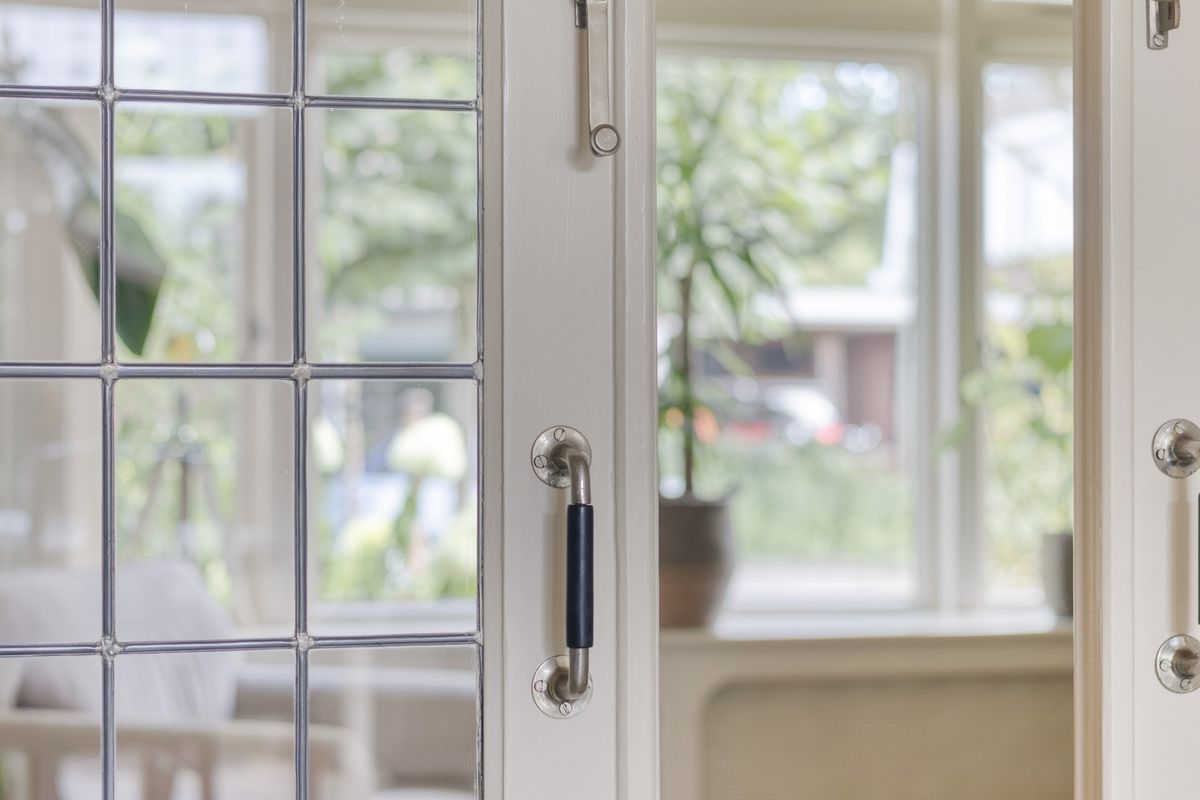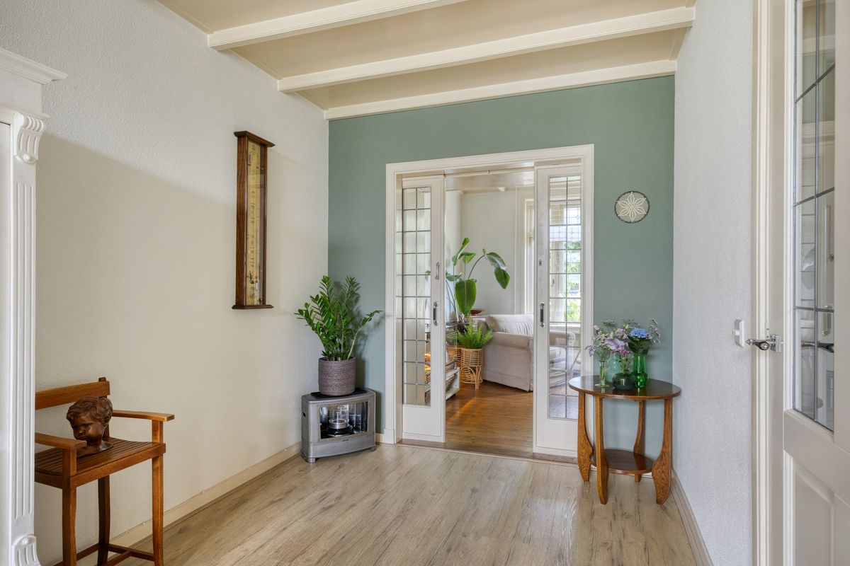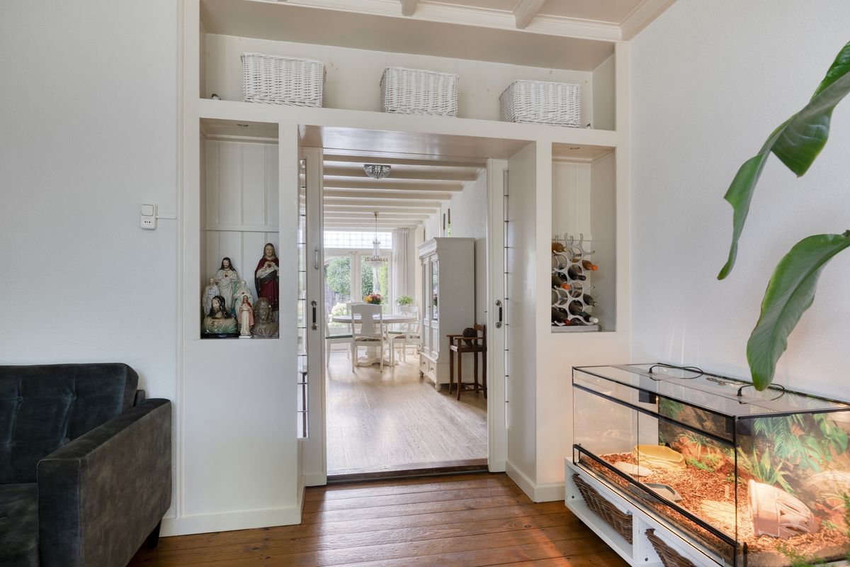 De voorkamer en de eetkamer zijn met elkaar verbonden via klassieke en-suitedeuren met vaste kasten. Deze originele indeling versterkt de jaren ’30 uitstraling van de woning.