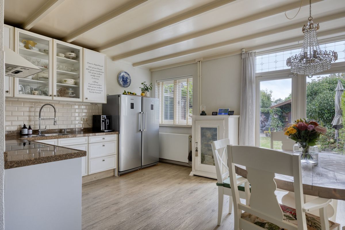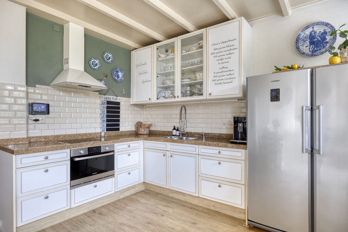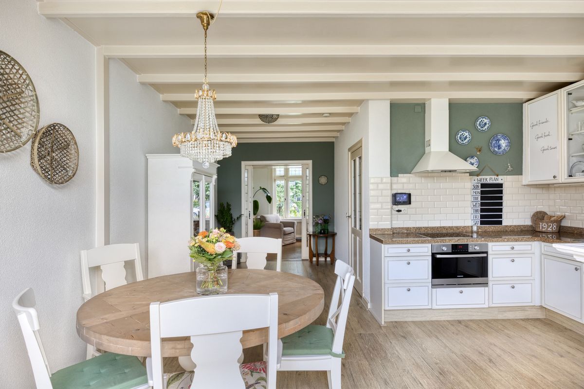 De eetkeuken aan de achterzijde vormt de centrale leefruimte van de woning. Dankzij de royale afmetingen is hier volop ruimte voor een grote eettafel, ideaal om met familie of vrienden uitgebreid te dineren of gezellig te borrelen. De keuken is uitgevoerd in een landelijke stijl en biedt zowel praktische werkruimte als voldoende kastruimte. De dubbele deuren naar de tuin zorgen voor een prettige lichtinval en een fijne verbinding met buiten. Vanuit de keuken is bovendien de berging en de overkapping bereikbaar.