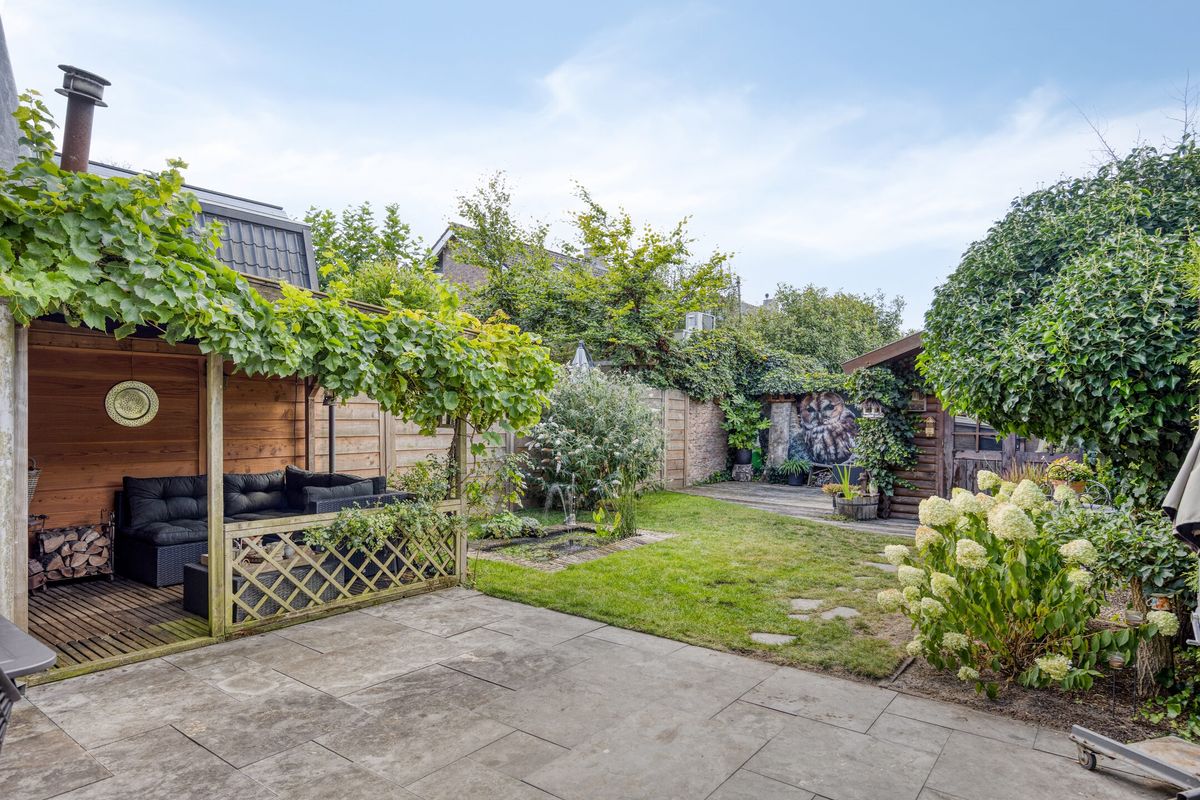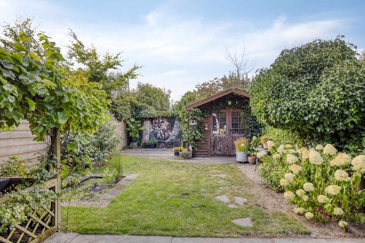 De achtertuin is gesitueerd op het westen, waardoor u vanaf de middag en avond volop van de zon kunt genieten. Achterin de tuin bevindt zich een houten berging, ideaal voor het opbergen van bijvoorbeeld tuingereedschap. Daarnaast is er een sfeervolle overkapping aanwezig, een fijne plek om beschut te ontspannen of gezellig buiten te zitten.