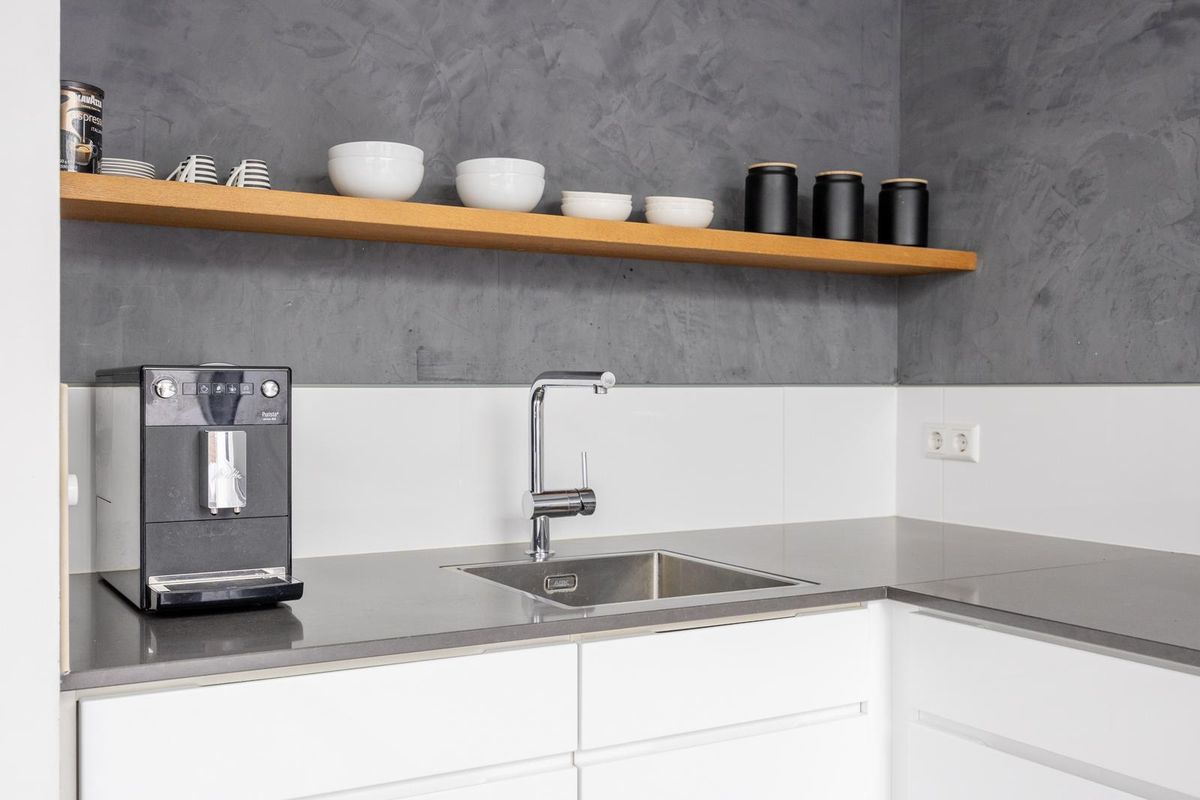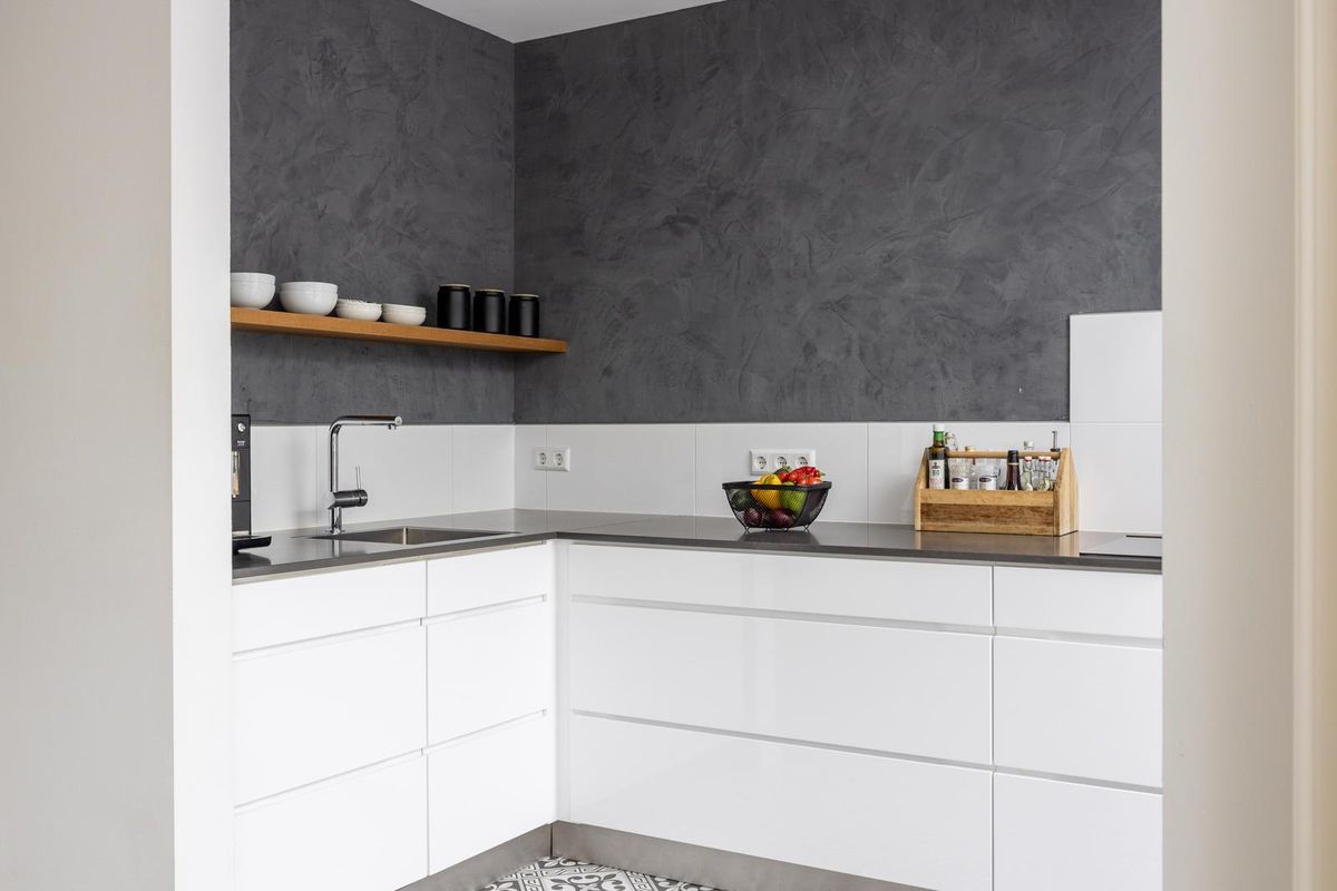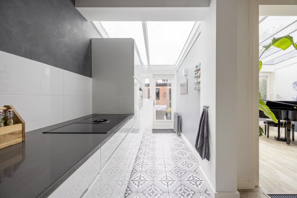 Naast de eetkamer is de open uitgebouwde keuken, met een lengte van iets meer dan 5 meter. De moderne keukenopstelling in een L-vorm is stijlvol en luxe, met alle benodigde inbouwapparatuur: een inductie kookplaat met afzuiging, vaatwasser, heteluchtoven, koelkast en een vriezer. De keuken heeft een zeer prettige aanrechtdiepte van 71 cm met veel werk- en opbergruimte.