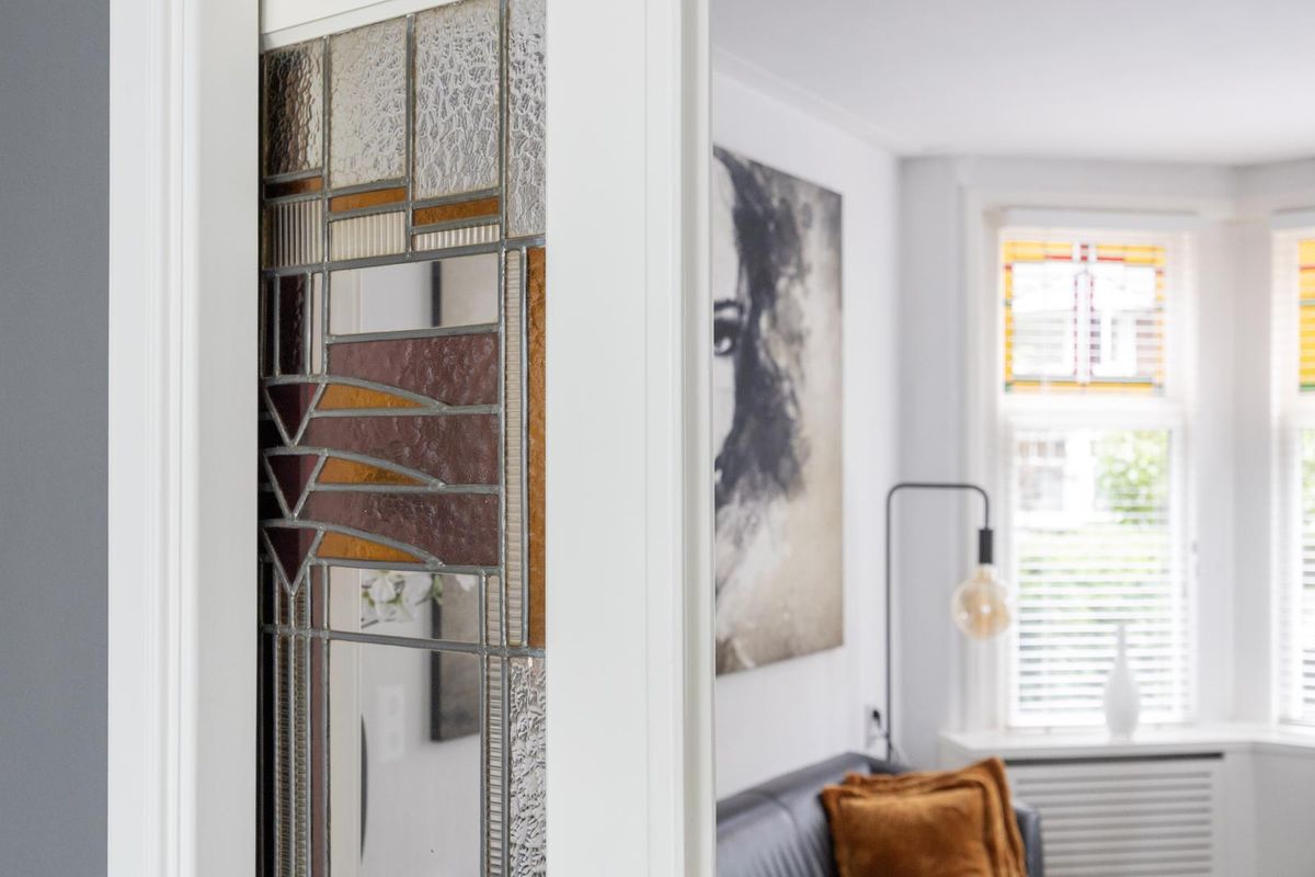 In de woon-/eetkamer zijn vele stijlelementen behouden, waaronder de en-suite deuren met marmeren schouwen en inbouwkasten. In de woonkamer valt uw oog ook op de erker met kleurrijke, originele, glas-in-loodramen. Deze kleurexplosie ziet u ook in de schuifdeuren die de woonkamer van de eetkamer scheidt.