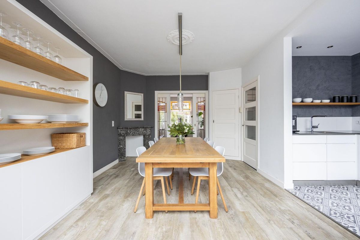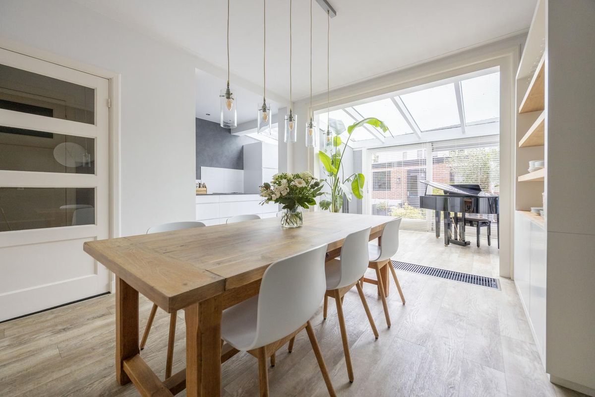 De eetkamer is een verrassende ruimte die aan de achterzijde is uitgebouwd met een lichte serre. Nu wordt de serre als muziekkamer gebruikt, maar een invulling als zitkamer, werkruimte of speelruimte voor de kinderen is natuurlijk ook mogelijk. De volledige ruimte is voorzien van een PVC vloer.