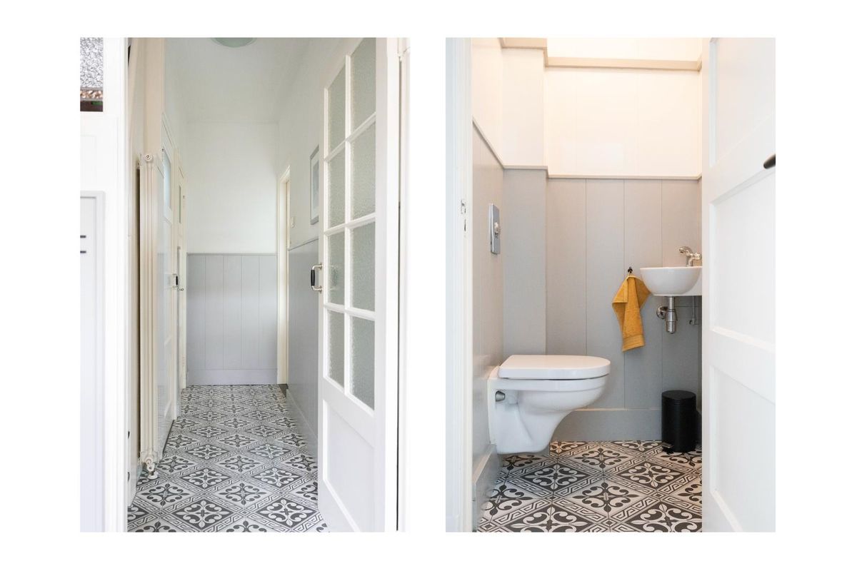 U komt binnen in een ruime hal met originele granieten vloer. Via de tussendeur bereikt u de gang die voorzien is van een patroon tegelvloer, lambrisering en de originele paneeldeuren. Hier bevindt zich de trap naar de eerste verdieping, de toiletruimte met fonteintje en de wijn-/provisiekelder.