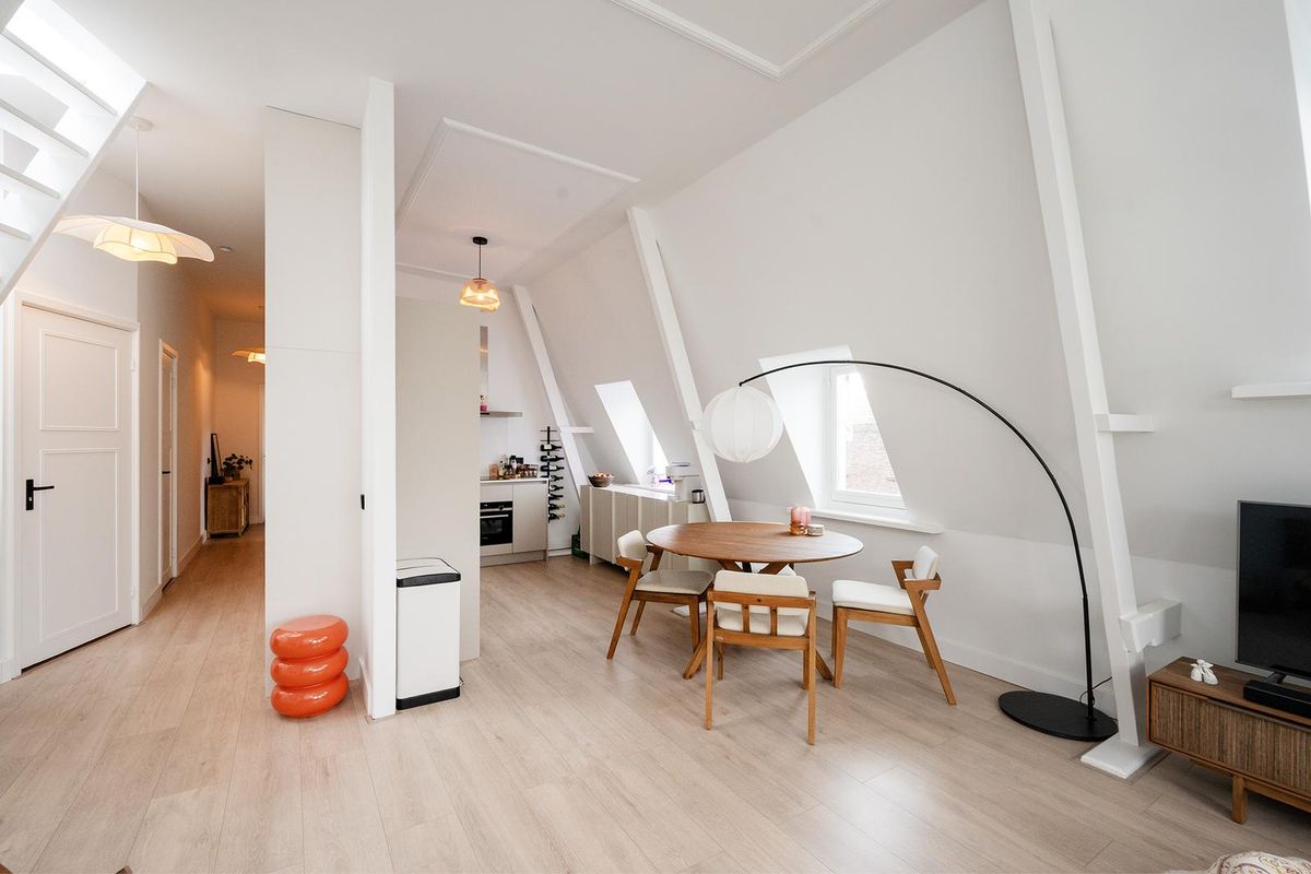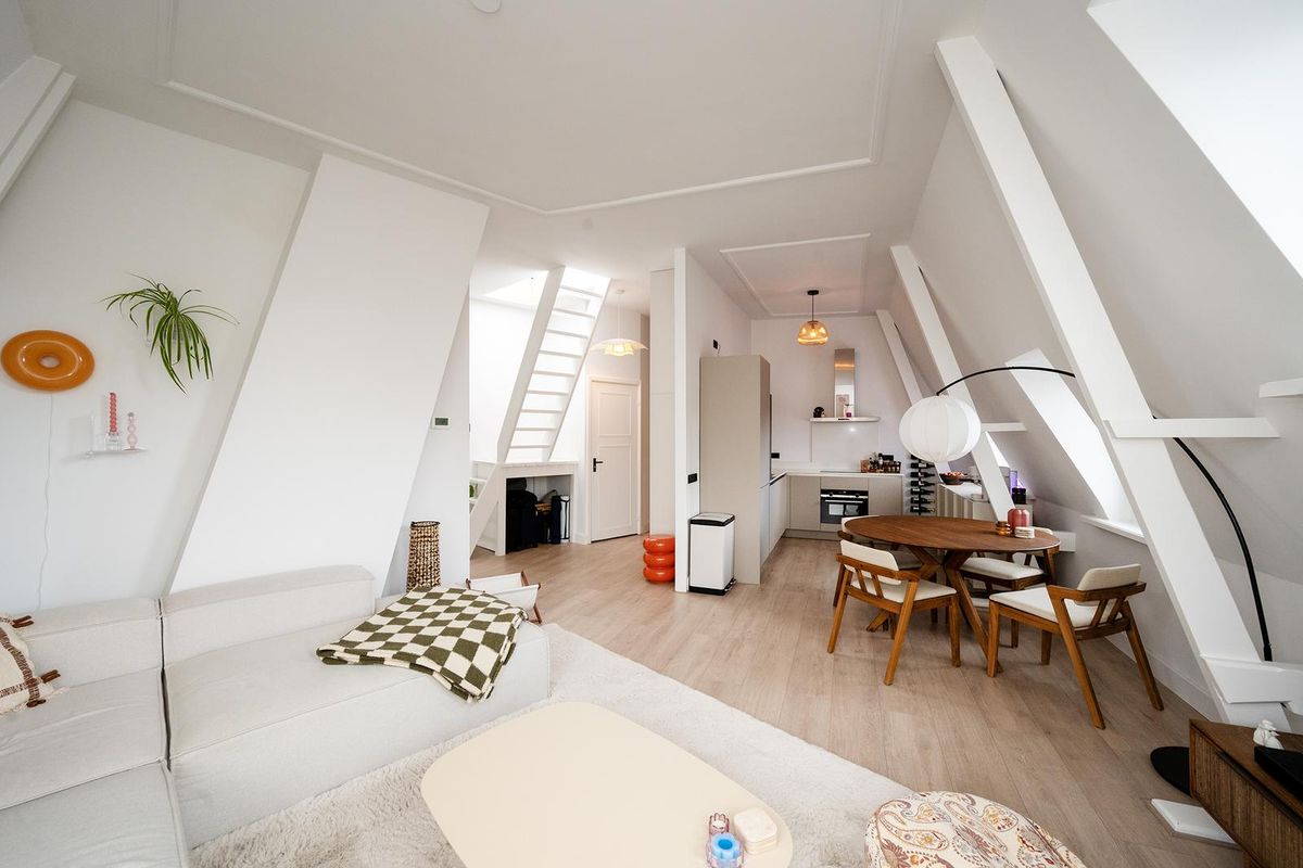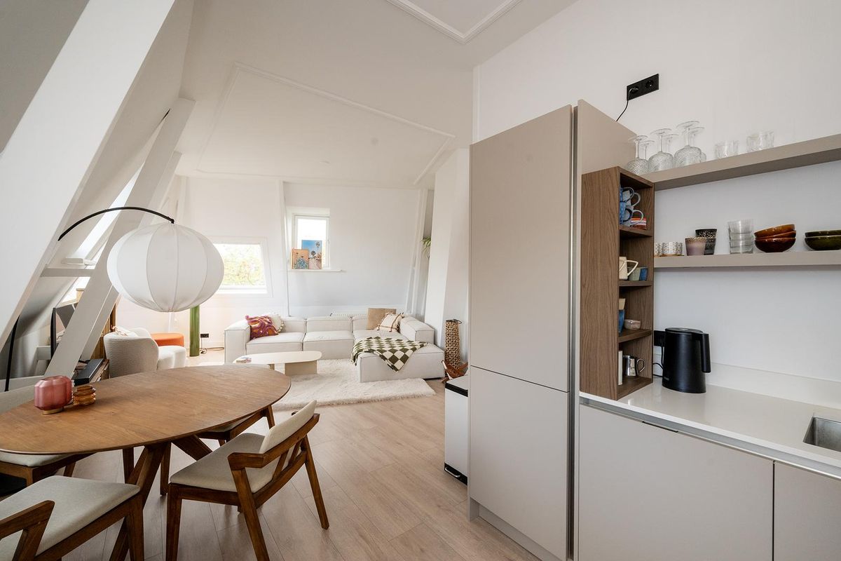 Boven aangekomen betreed je de lichte woonkamer met open keuken, die dankzij de speelse raampartijen een warme loft-sfeer heeft. De keuken is modern en luxe uitgevoerd, voorzien van inbouwapparatuur zoals een koelkast, vriezer, combi-oven/magnetron, inductiekookplaat, afzuigkap en vaatwasser. De gezellige inrichting met eettafel en zithoek maakt het een fijne plek om te ontspannen of gasten te ontvangen.