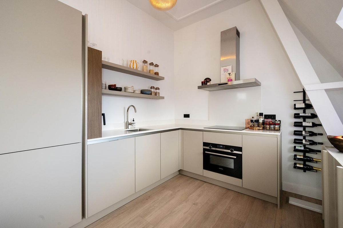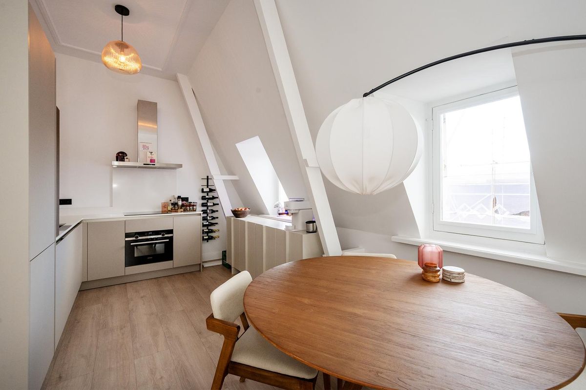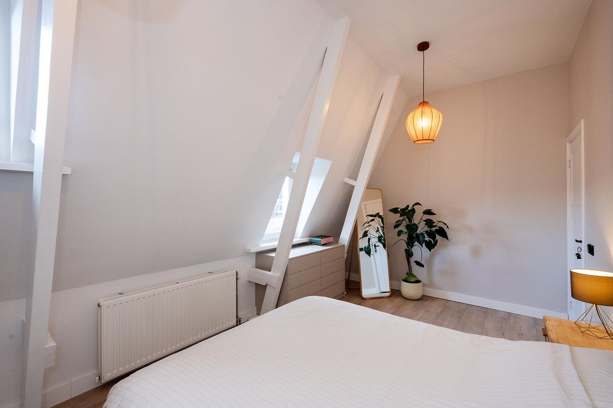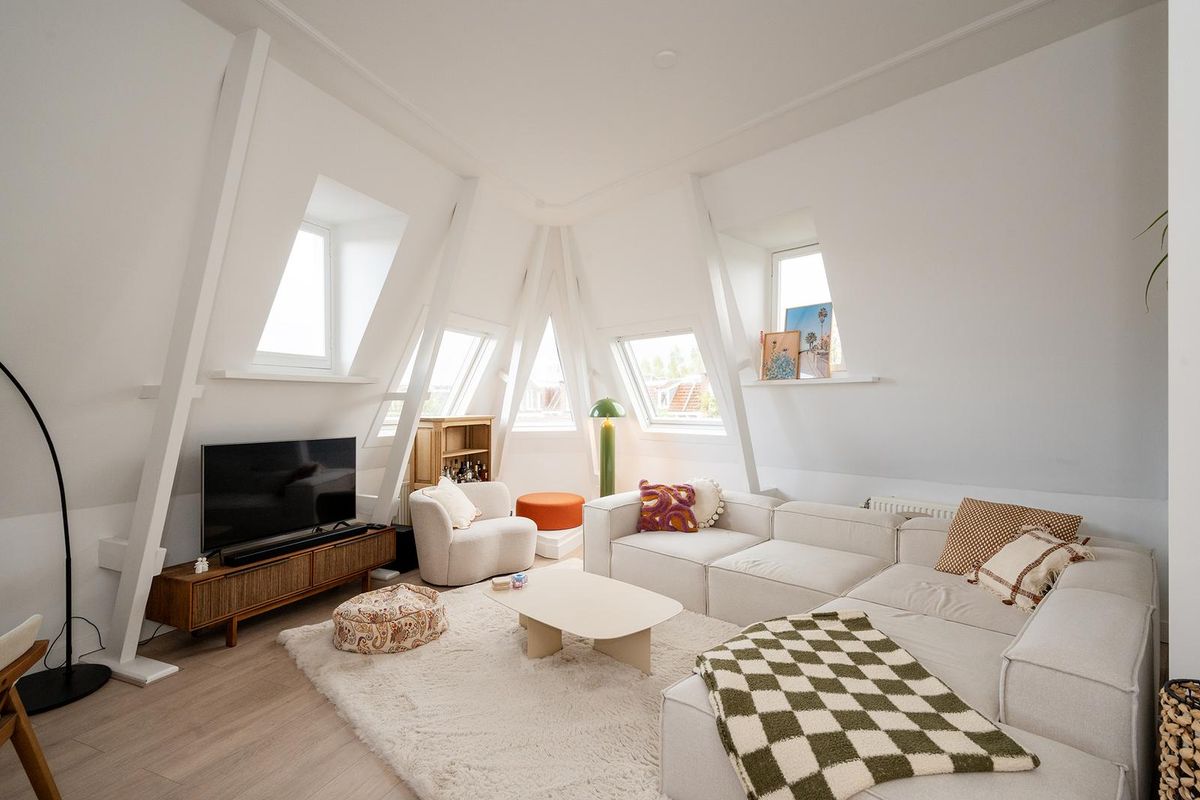 Boven aangekomen betreed je de lichte woonkamer met open keuken, die dankzij de speelse raampartijen een warme loft-sfeer heeft. De keuken is modern en luxe uitgevoerd, voorzien van inbouwapparatuur zoals een koelkast, vriezer, combi-oven/magnetron, inductiekookplaat, afzuigkap en vaatwasser. De gezellige inrichting met eettafel en zithoek maakt het een fijne plek om te ontspannen of gasten te ontvangen.