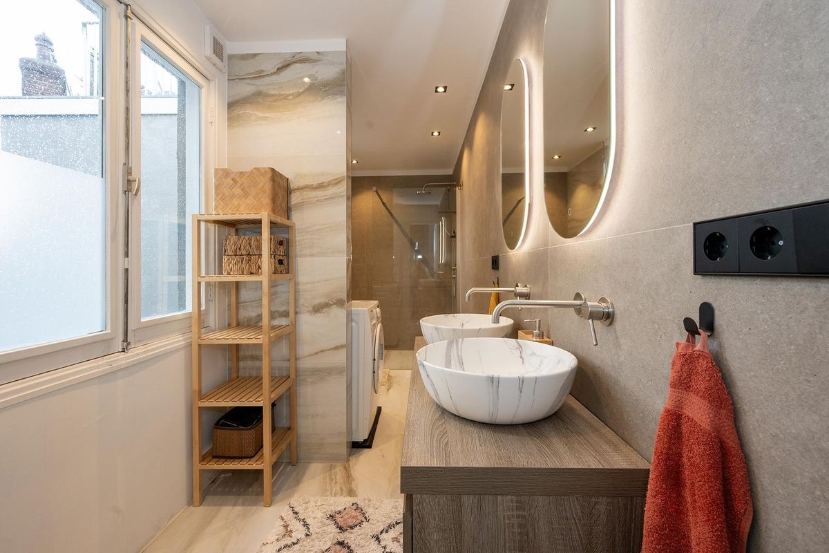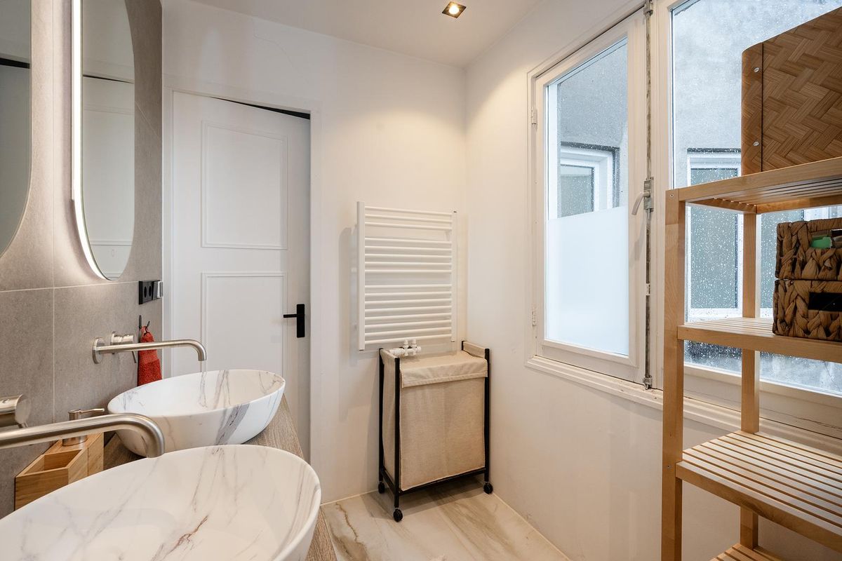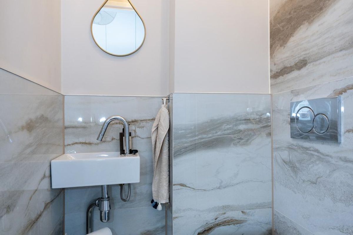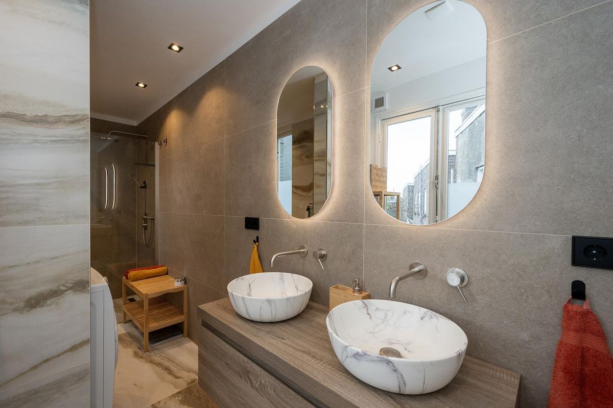 De badkamer is modern en strak afgewerkt met een ruime inloopdouche, dubbele wastafel met meubel en wasmachine. Er is tevens een separaat toilet aanwezig.