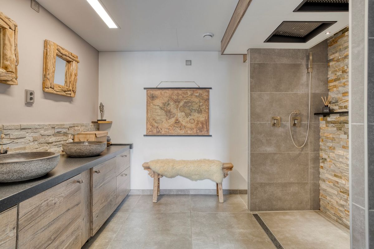 De badkamer is voorzien van een royale inloopdouche en stijlvol wastafelmeubel.