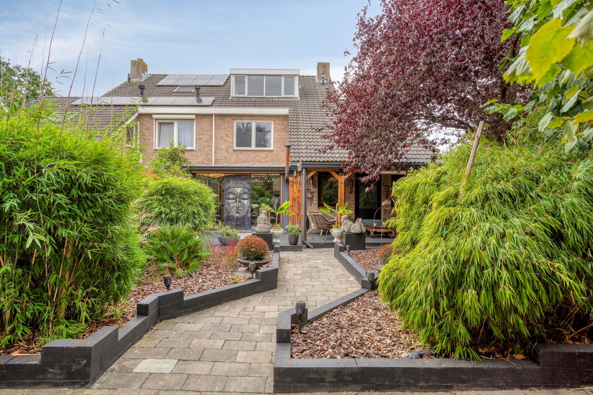 De achtertuin is volwassen aangelegd met groenborders en bestrating. Vanuit de serre en overkapping heeft u zichtlijnen tot achter op het perceel – een prachtig uitzicht over uw eigen stukje buitenruimte.