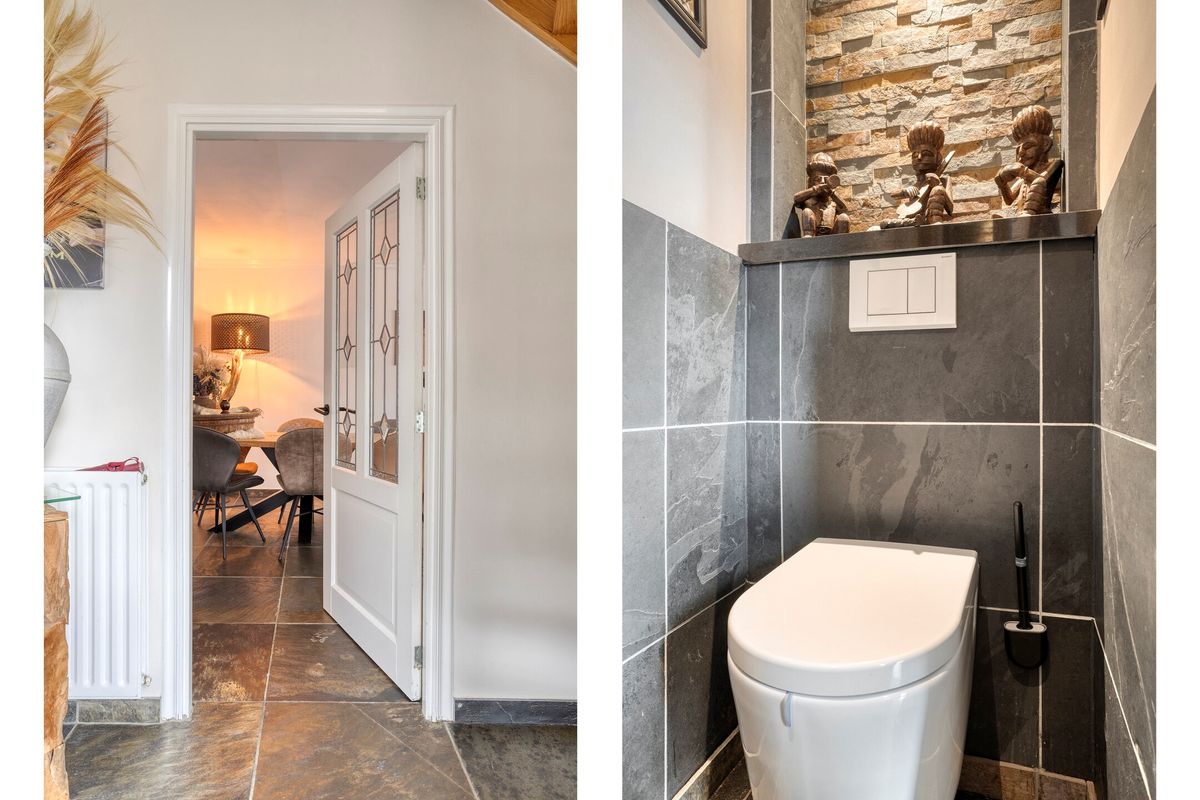 De toiletruimte is uitgevoerd in dezelfde stijl als de badkamer.