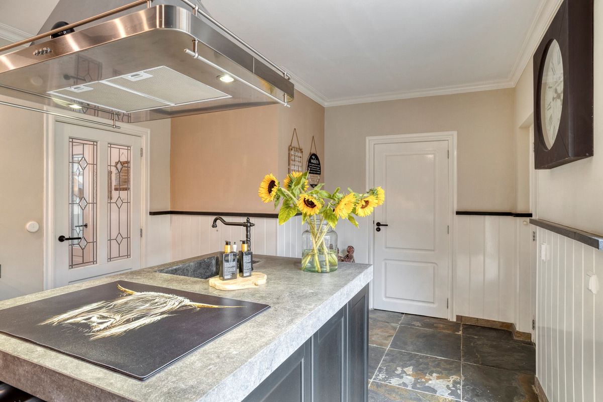 De keuken biedt toegang tot de serre, met Taats schuifpui, en het tussenportaal. Vanuit hier bereikt u de bijkeuken en een multifunctionele kamer (slaap-/werkkamer).
