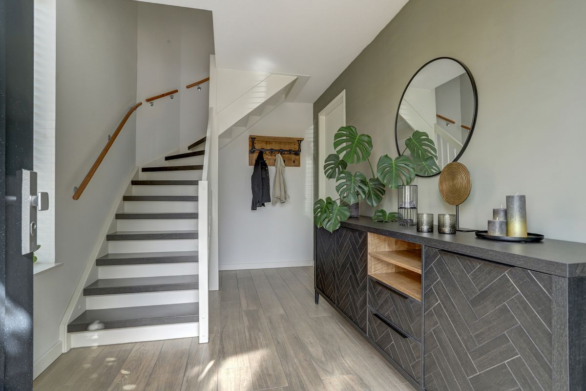 Vanuit de overdekte entree stap je zo de woning binnen en niet zomaar een halletje. Hier heb je alle ruimte: geen geduw of gestoei met jassen, maar een fijne binnenkomer waar je meteen de trap naar boven, de meterkast én de lichte doorzon-woonkamer vindt.