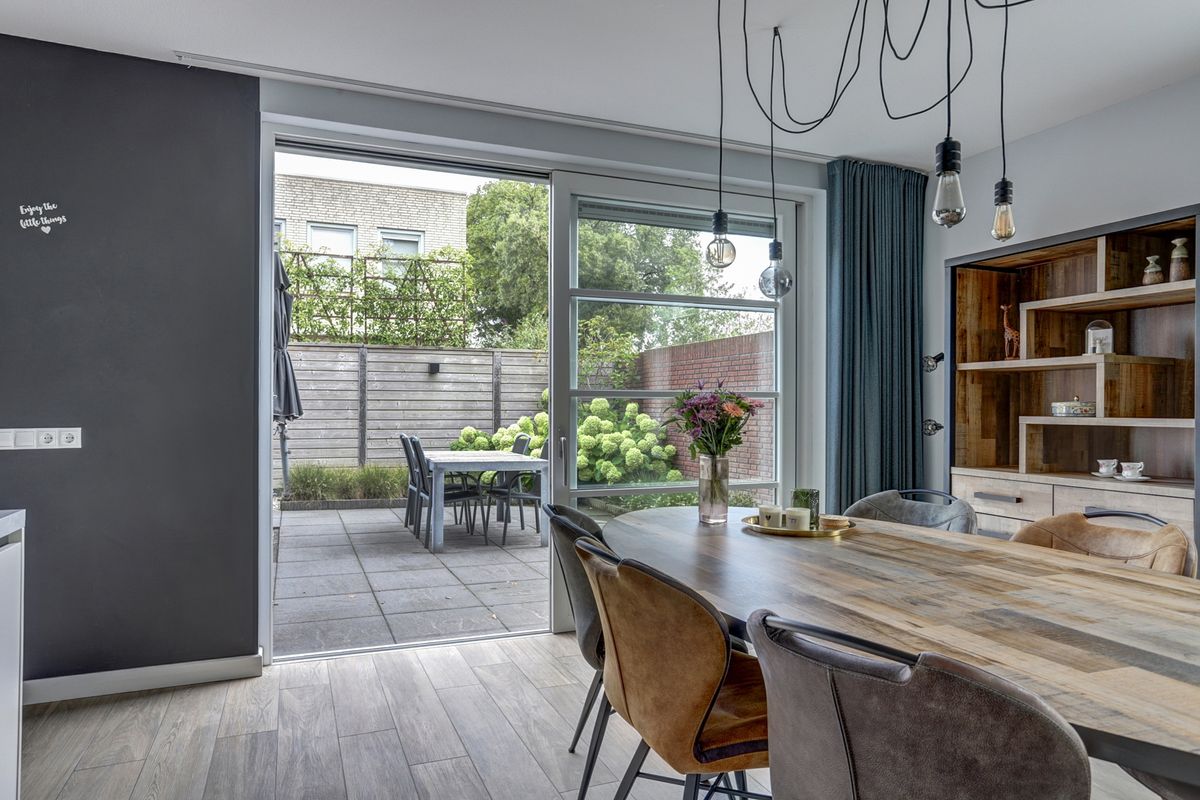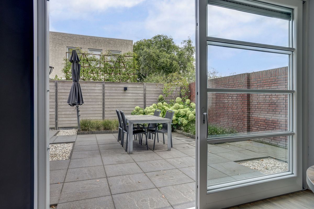 Vanuit de woonkamer stap je zó via de schuifpui de tuin in, heerlijk toch? Ook via het achterportaal is de tuin direct bereikbaar.