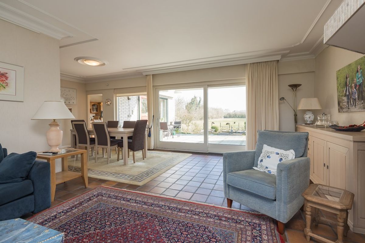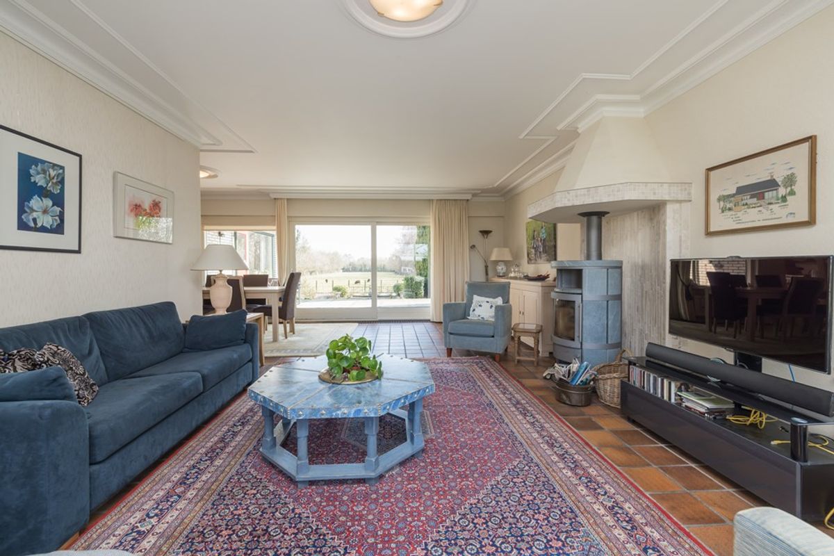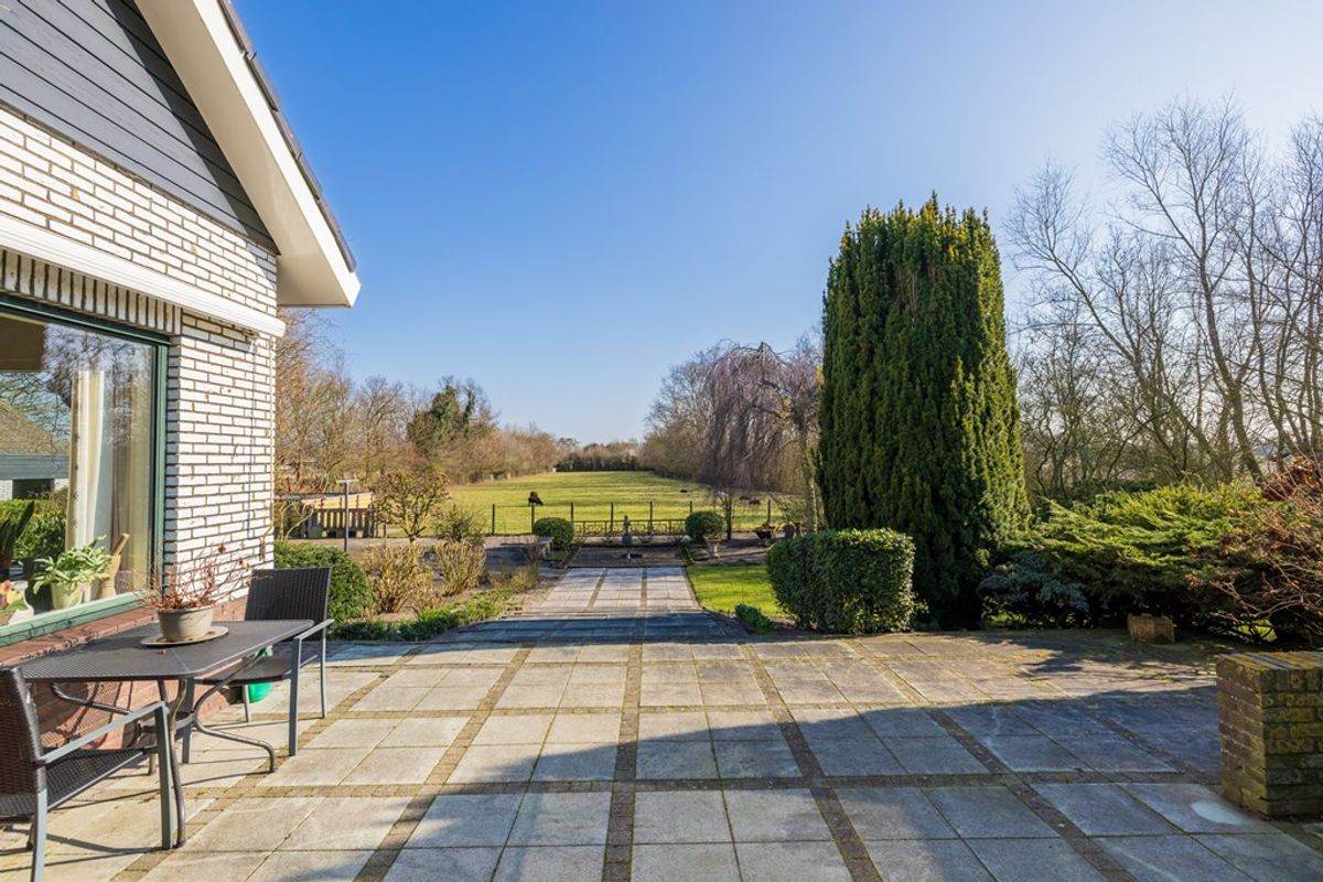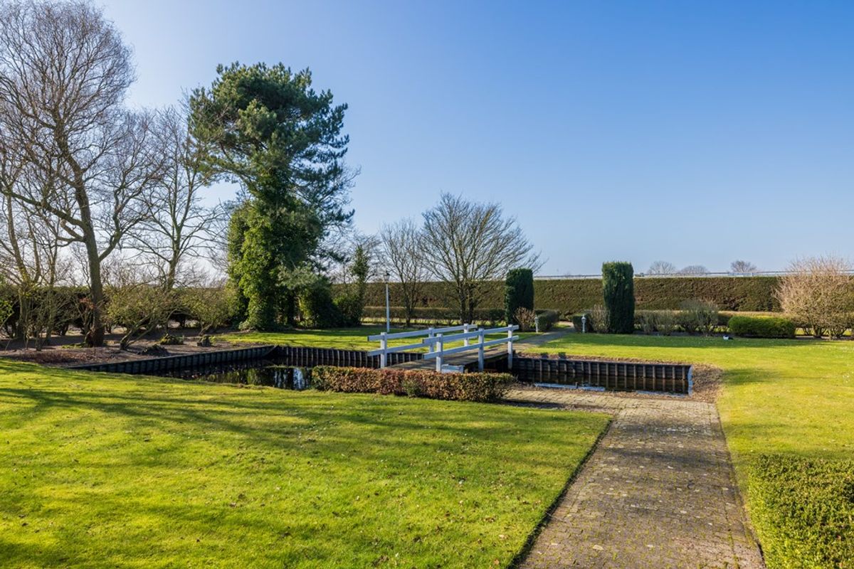 De meer dan riante voortuin is met zorg aangelegd en voorzien van een sproeisysteem, een vijver, een bruggetje en een prachtige fontein. Aan de achterzijde is er een groot zonnenterras aangelegend met vrij uizicht over de schapenweide.