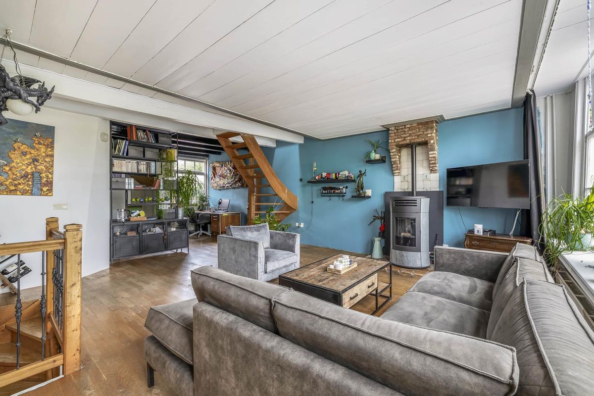 Hier bevindt zich de royale living van circa 27 m², voorzien van een parketvloer. Ook vanaf hier geniet u weer van het prachtige uitzicht op de haven. Er is een sfeervolle spekstenen pelletkachel aanwezig, welke is aangesloten op de cv-ketel.